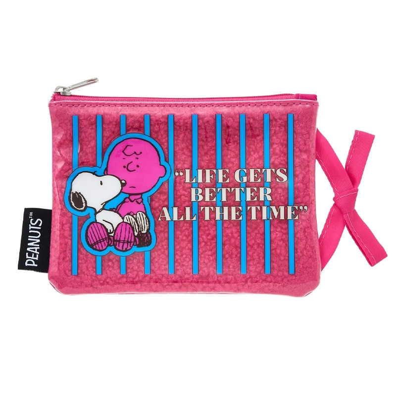 PLAZA限定!もこもこボア素材にPVCの透明シートをコーティングしたSサイズのポーチ。大きくプリントされたPEANUTSのなかまたちがとってもキュート♪