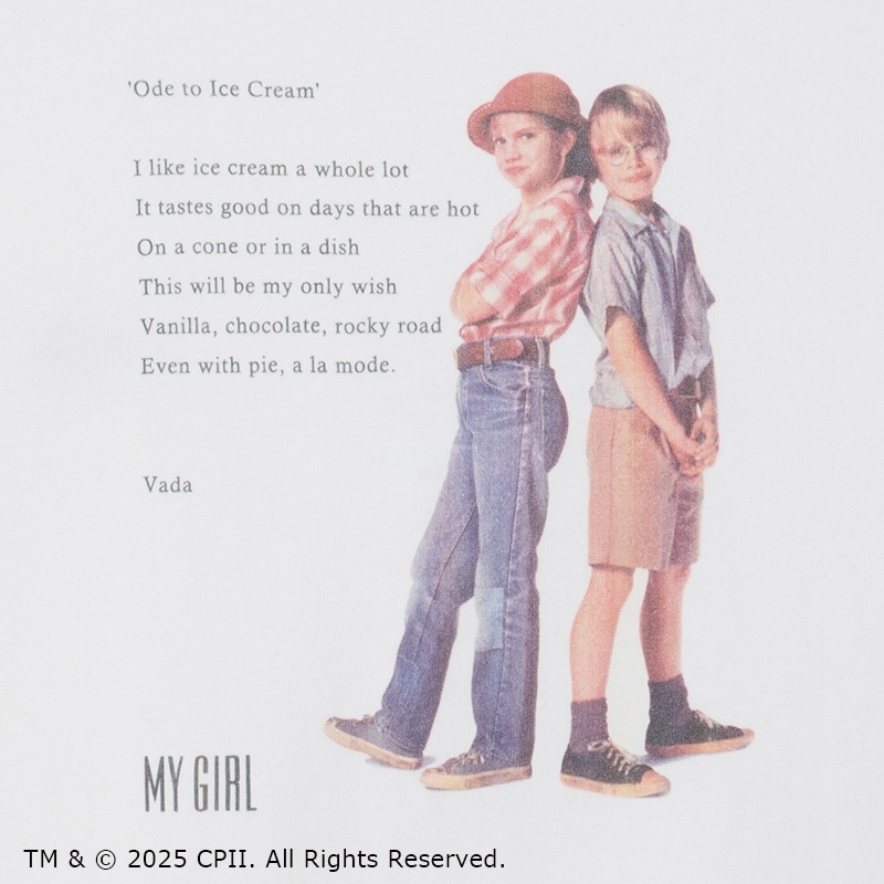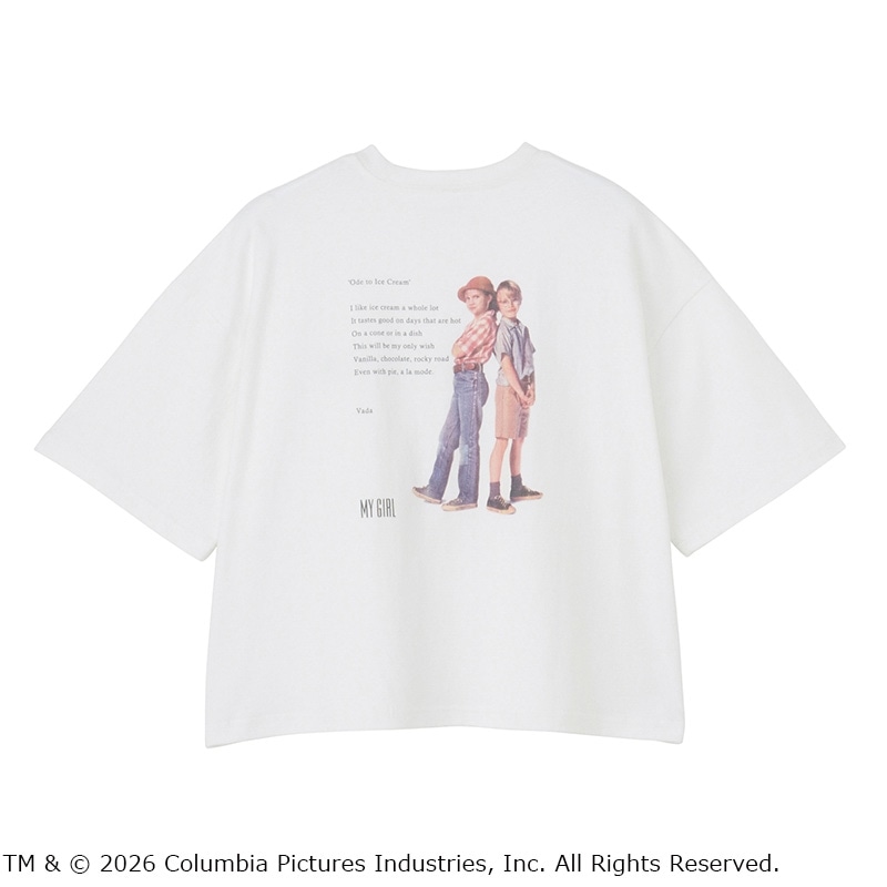 初恋映画の金字塔として愛され続ける『マイ・ガール』のメインビジュアルがTシャツになりました。 あえて彩度を落としたレトロなフォトプリントが、ノスタルジックな雰囲気を演出。90年代の空気感で、古着ミックス風の着こなしが楽しめます。ワイドスリーブとボックスシルエットで、ラフなのにすっきりとしたバランスに。