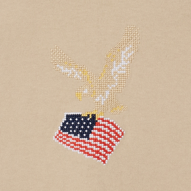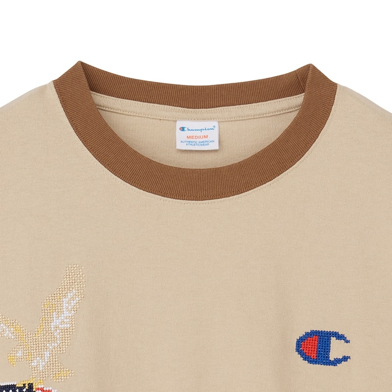 星条旗とイーグルという、アメリカらしいデザイン。ネックの配色切り替えで、レトロ感もプラスした「Champion(チャンピオン)」のTシャツです。プリントではなく、ピクセルアートを思わせるクロスステッチでの表現が個性的な1枚。ウォッシュ加工でトレンドの古着テイストコーデにもぴったりです。