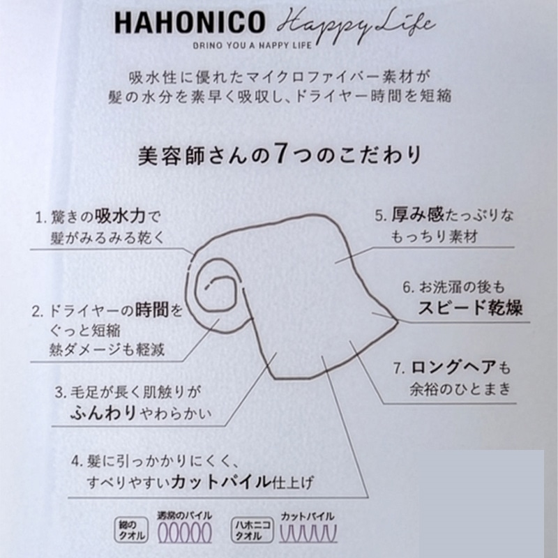 ロングヘアもショートヘアもふんわりとひと巻きで包み込む、美容師さんが考えた髪のためのタオル。さらにもっちりふわふわ&吸収力がアップしてリニューアル。毛足が長いふんわり加工したマイクロファイバー素材を使用。タオルドライでも驚きの吸水力と吸水スピードでドライヤー時間を短縮し、熱ダメージを軽減します。髪がひっかかりにくいパイルカット仕上げ。プレゼントにもおすすめ。