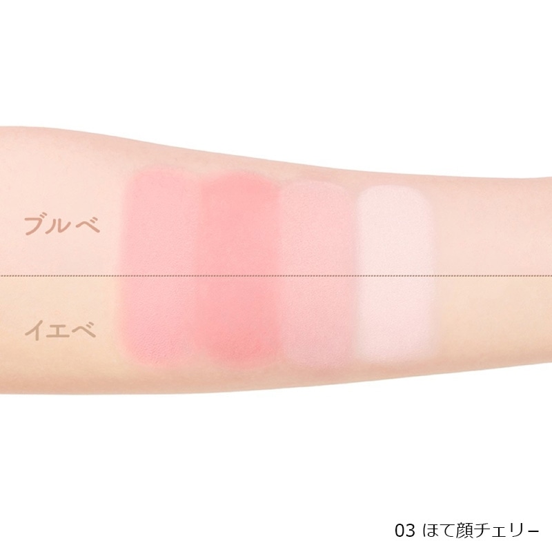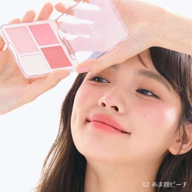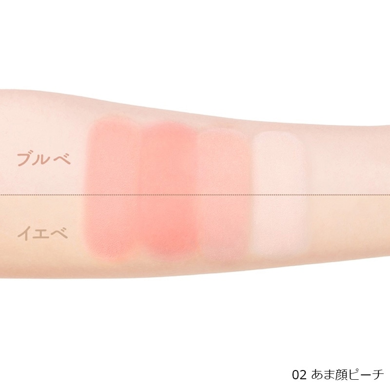 血色感(※)も立体感も演出できるマルチパレット。チークカラー2色、シェーディングカラー、マットハイライトの4色入りで、涙袋メイクやフェイスラインの陰影メイクなど多彩なメイクに対応可能!チークカラーはアイシャドウとしても使えるので、顔全体が統一感のある仕上がりに。みずみずしい桃のようなスウィートなピンクカラーの「02 02 あま顔ピーチ」と、ほてり顔であざとさをプラスする「03 ほて顔チェリー」。