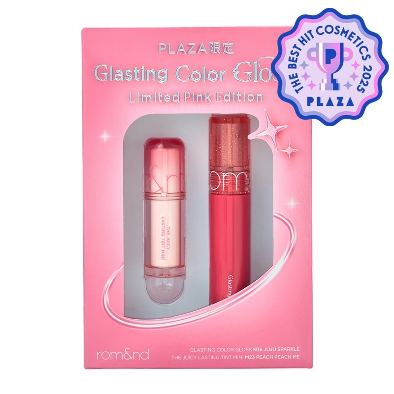 PLAZA限定の数量限定品!「rom&nd(ロムアンド)」のグラスティングカラーグロスに、PLAZA限定の偏光パール入りカラー“ジュジュスパークル”が登場。さらにピーチコーラルカラーのザジューシーラスティングティント“23 ピーチピーチミー”付き!PLAZAのみで手に入るリミテッドピンクエディションです。肌なじみが良いのに顔が一気に華やぐ、秀逸なピンクカラーの競演です!