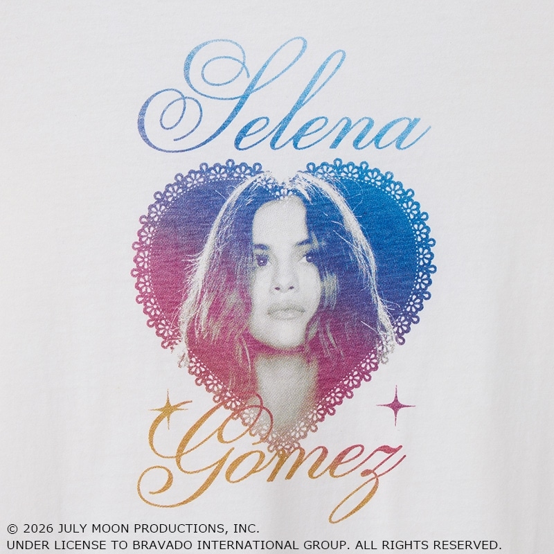 PLAZA限定!多才なアーティストとして輝き続ける「Selena Marie Gomez(セレーナ・ゴメス)」の魅力を表現。レースモチーフのハートの中に、アンニュイな表情を閉じ込めたフォトプリントを配置。ホワイトのボディに映える、ブルー、ピンク、オレンジのグラデーションカラーが美しいデザインです。コンパクトシルエットですっきり合わせられます。