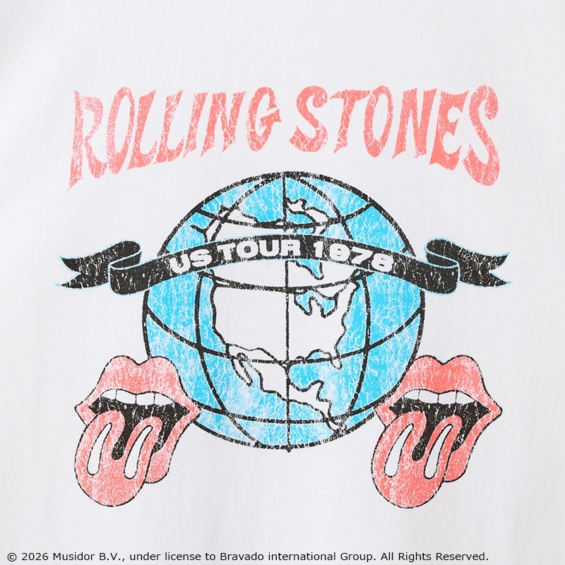 PLAZA限定!「The Rolling Stones(ザ・ローリング・ストーンズ)」が1978年に敢行した伝説的な全米ツアーがモチーフ。ハードなかすれプリントで、ヴィンテージ感溢れるデザインに仕上げました。地球儀をバックに「US TOUR 1978」のバナーと、バンドの象徴である「リップス&タン」をレイアウト。ホワイトのボディに映える爽やかな色使いで、コーディネートに取り入れやすい1枚です。