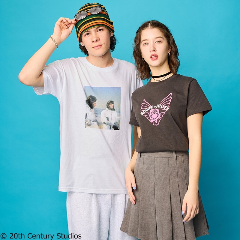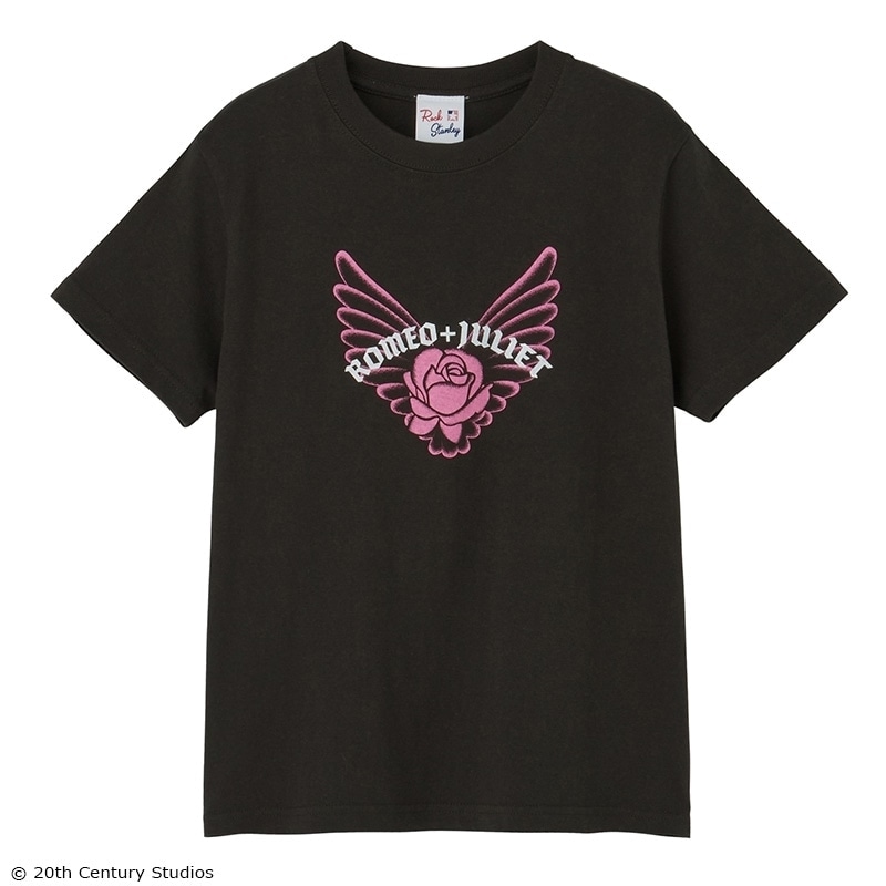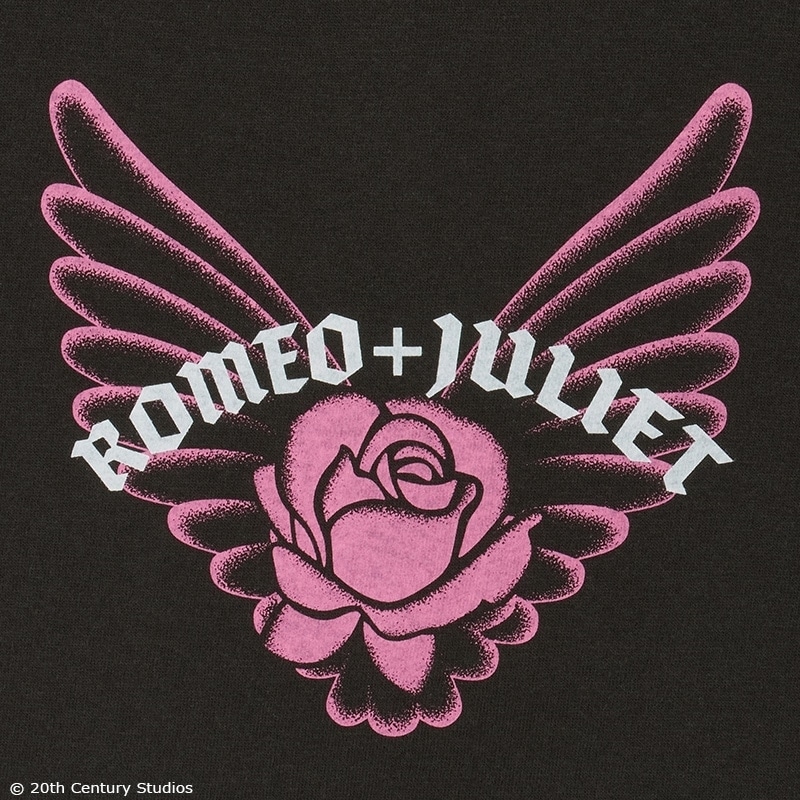 PLAZA限定!1996年に公開され、「レオナルド・ディカプリオ」の瑞々しい演技と鮮烈な映像美が話題を呼んだ映画『ロミオとジュリエット』のシネマTシャツです。作品を象徴する「バラと翼」のモチーフを、風合いのあるスミクロ地に大胆にプリント。映画の持つダークでロマンティックな世界観を凝縮した、甘辛な着こなしに映える1枚です。