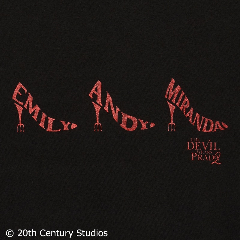 PLAZA限定!ファッションラバーのバイブルとして、世代を超えて愛される『プラダを着た悪魔』のTシャツです。主要キャラクター3人の名前がハイヒールになったスタイリッシュなデザイン。キラキラのラメプリントで、ラグジュアリー感たっぷりな1枚です。