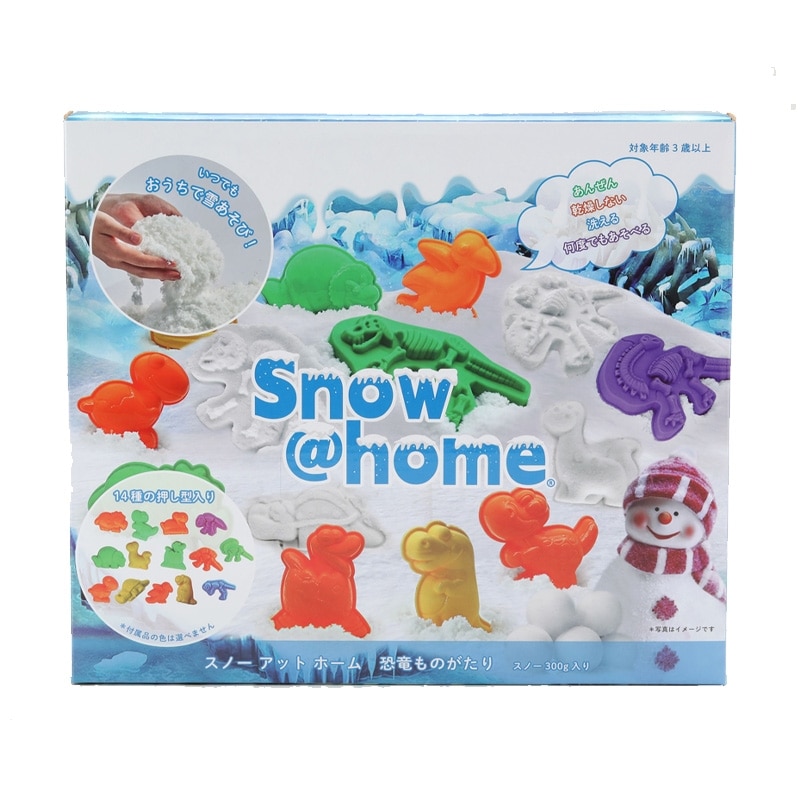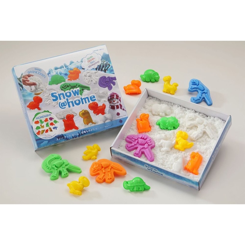 子供の想像力を養なうスノー@ホーム。お家で遊べる不思議な手触りのおもちゃです。ギュッと握るとかたまり、 指先でほぐすとふわふわとこぼれます。大人気の恐竜をテーマに化石の恐竜が作れる押し型がついています。