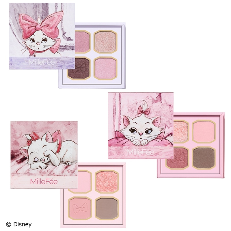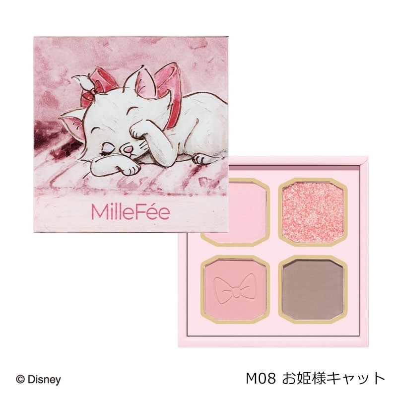 PLAZA・MINiPLA他5社先行販売の数量限定アイテム!「MilleFee(ミルフィー)」のアイシャドウパレットが、『おしゃれキャット』に登場する人気キャラクター「マリー」とコラボレーションした限定パッケージに入って登場!愛され系ピンクカラー3色に締め色1色を加えた4色入りで、愛らしい目元を演出します。全3色のうち“M08 お姫様キャット”は、マリーをイメージした限定カラー。