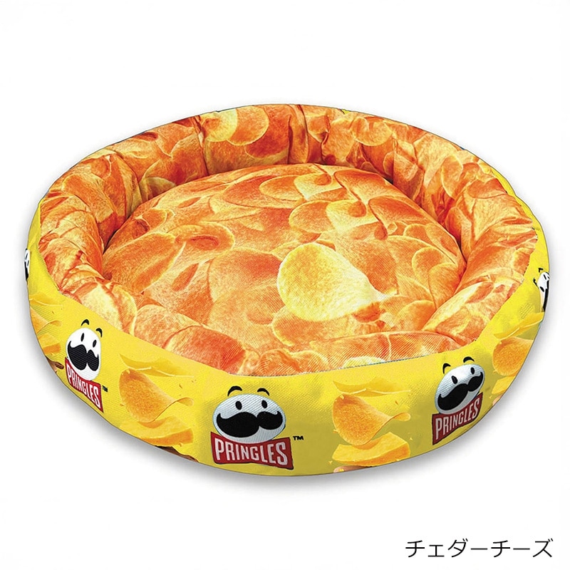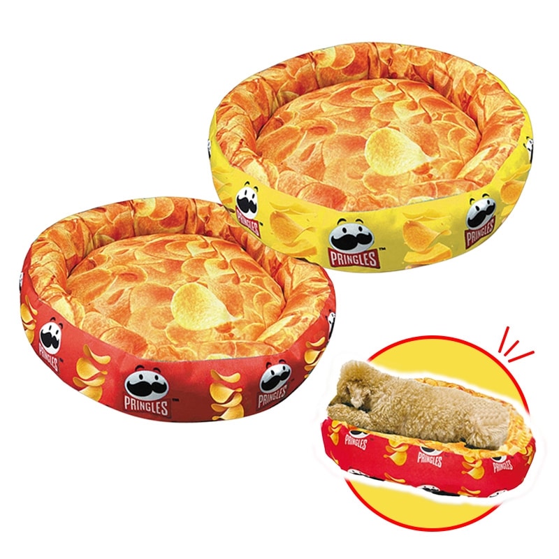 ユニークでインパクト抜群!外側はあのプリングルズパッケージ柄、内側はなんとポテトチップスがぎっしり敷き詰められたようなデザインのペットベッドです。まるでポテチの中にうもれているようなふかふか感で、わんちゃん・ねこちゃんもうっとり♪見た目の楽しさだけでなく、しっかりとしたクッション性で、毎日のくつろぎ時間を快適にサポートします。お部屋のアクセントにもなるキャッチーなデザインで、遊び心たっぷりのアイテムです。