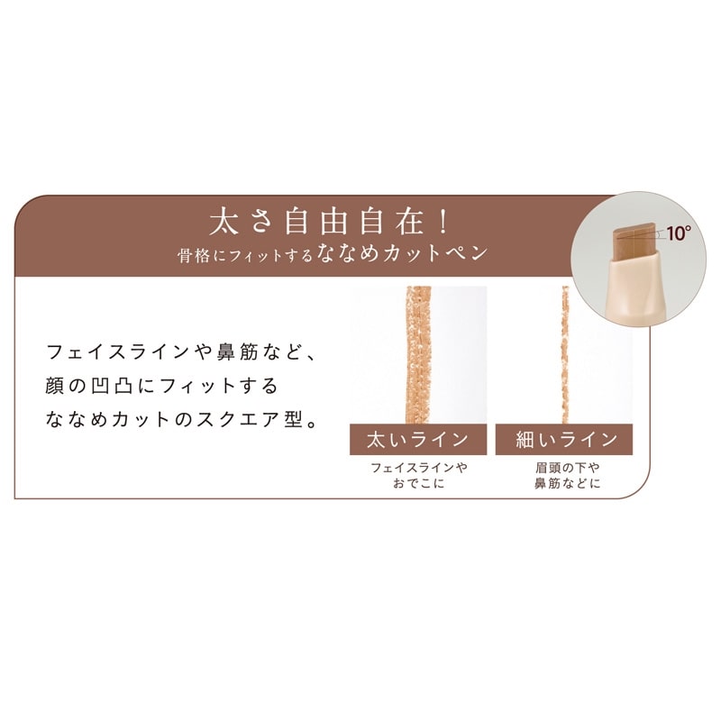 2026年3月25日(水)までPLAZA他1社先行販売!肌に溶け込むシアーな発色で自然な立体感を演出できる、「描く小顔矯正」的発想のシェーディングペンシル。濃く付きすぎないパウダリーな質感で失敗しにくいので、シェーディング初心者さんにもおすすめ。骨格にぴったりフィットする斜めカットのスクエア型ペンシルは、太いラインも細いラインも自在に表現可能。