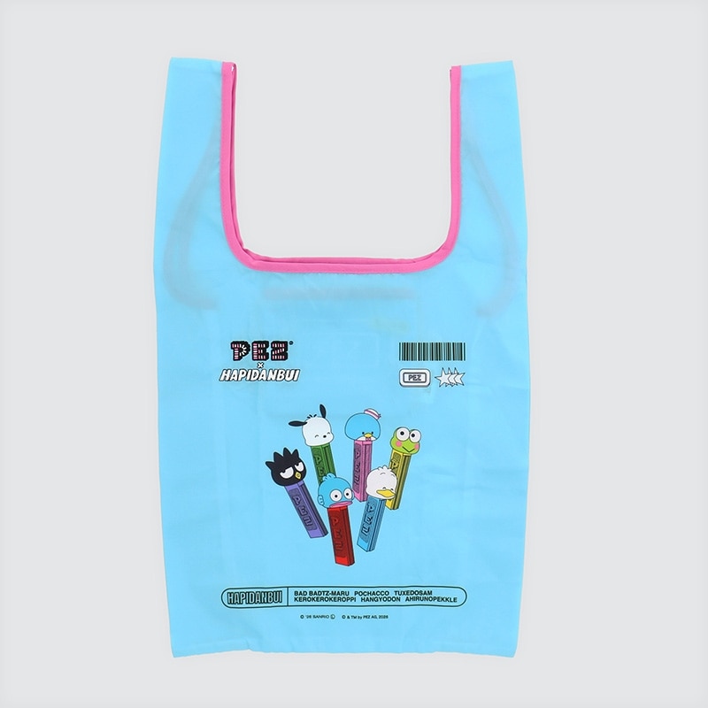 サンリオの人気キャラクターユニット「はぴだんぶい」と、キャンディブランド「PEZ(ペッツ)」がコラボレーション。ポップなカラーがアクセントになったマルシェバッグです。軽くて使いやすい素材で普段のお買い物やお出かけにお使いいただけます。使わないときは内ポケットにくるっと収納して、コンパクトに持ち運び可能!バッグの中でもかさばらず、いつでもサッと取り出せて便利です。