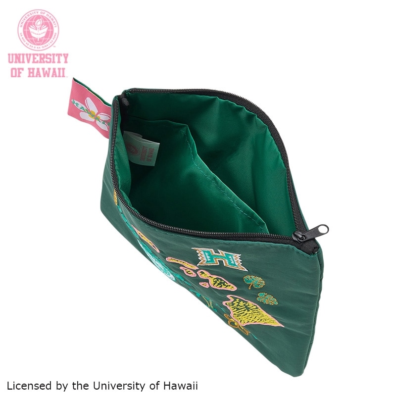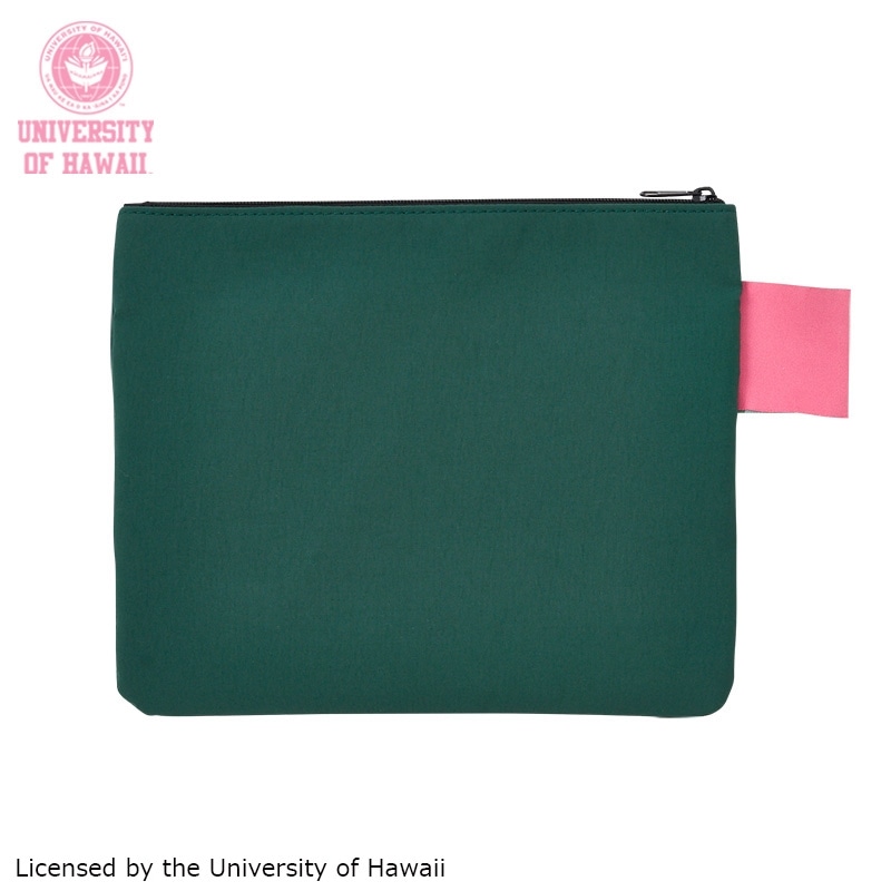 PLAZA限定!ハワイ大学デザインのフラットポーチです。フラットな形でかさばらず、バッグの中でもすっきり収まるポーチ。コスメや小物をまとめるのに便利で、持ち歩き用にもぴったりです。ご自身用にはもちろん、贈り物としてもおすすめです。