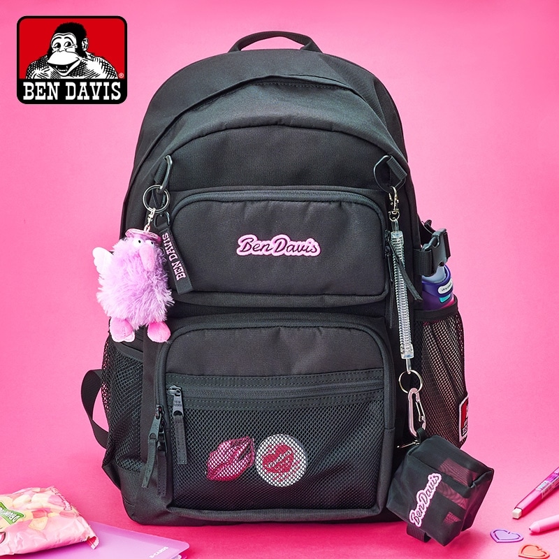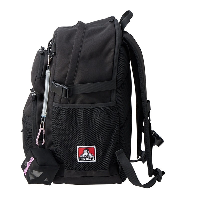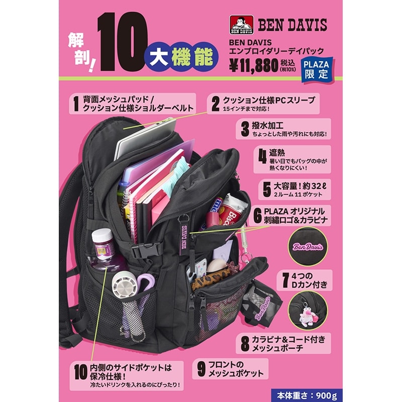 PLAZA限定!ピンクのロゴがアクセントになった「BEN DAVIS(ベン デイビス)」のデイパックが登場!大きめサイズで普段使いはもちろん、通勤・通学や旅行にもぴったりです。フロントやサイドにポケットがたくさんついているので、小物の収納に便利。チャーム代わりになるメッシュキューブのミニポーチ付きです。