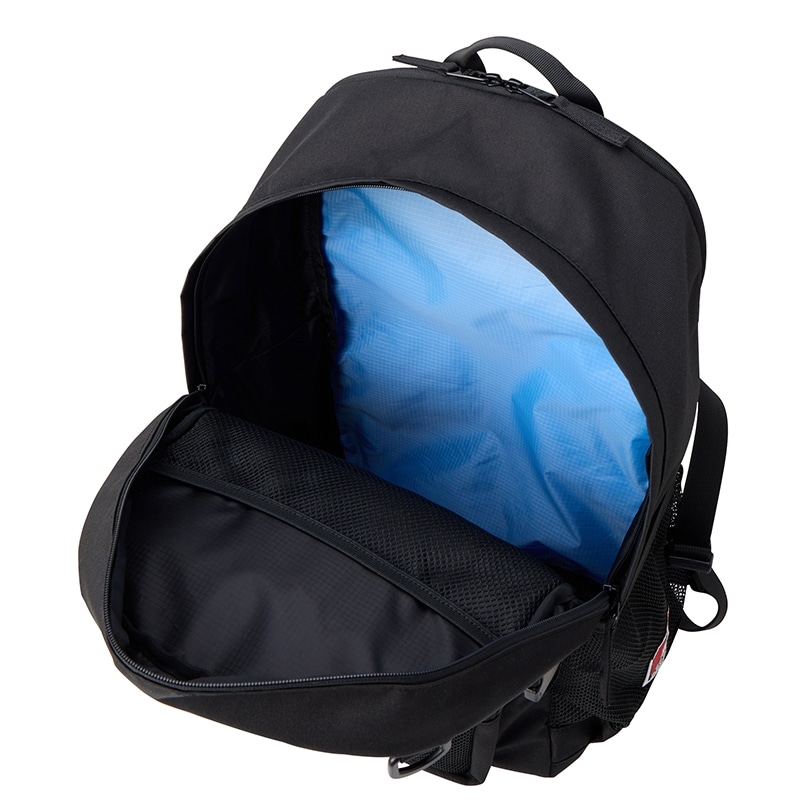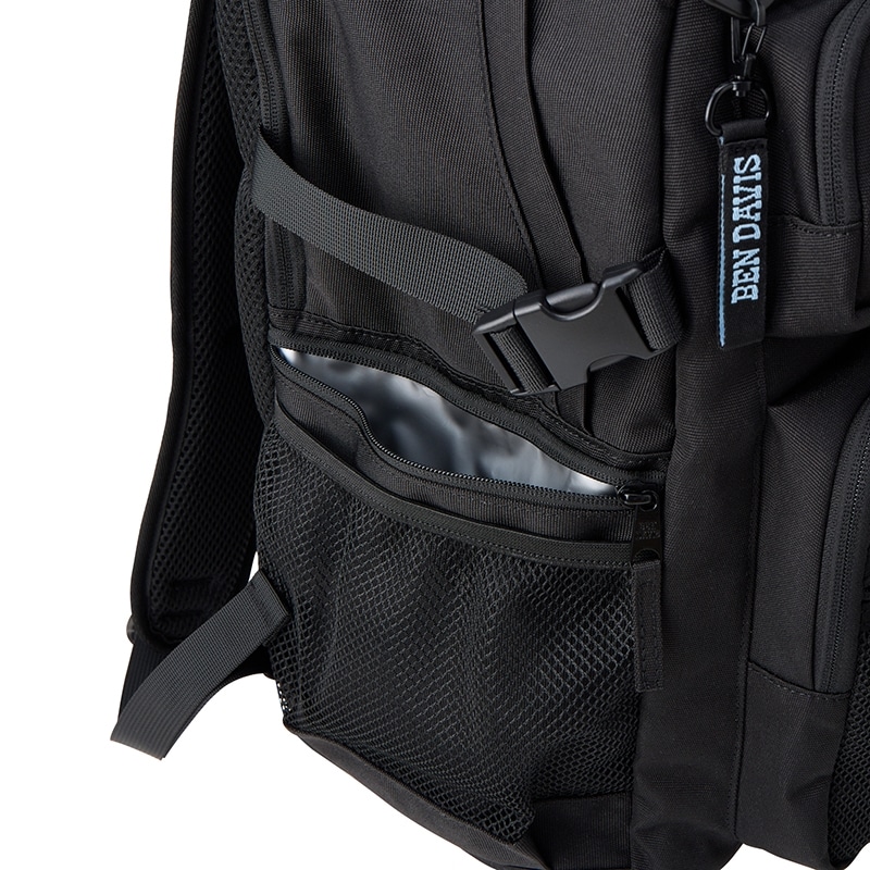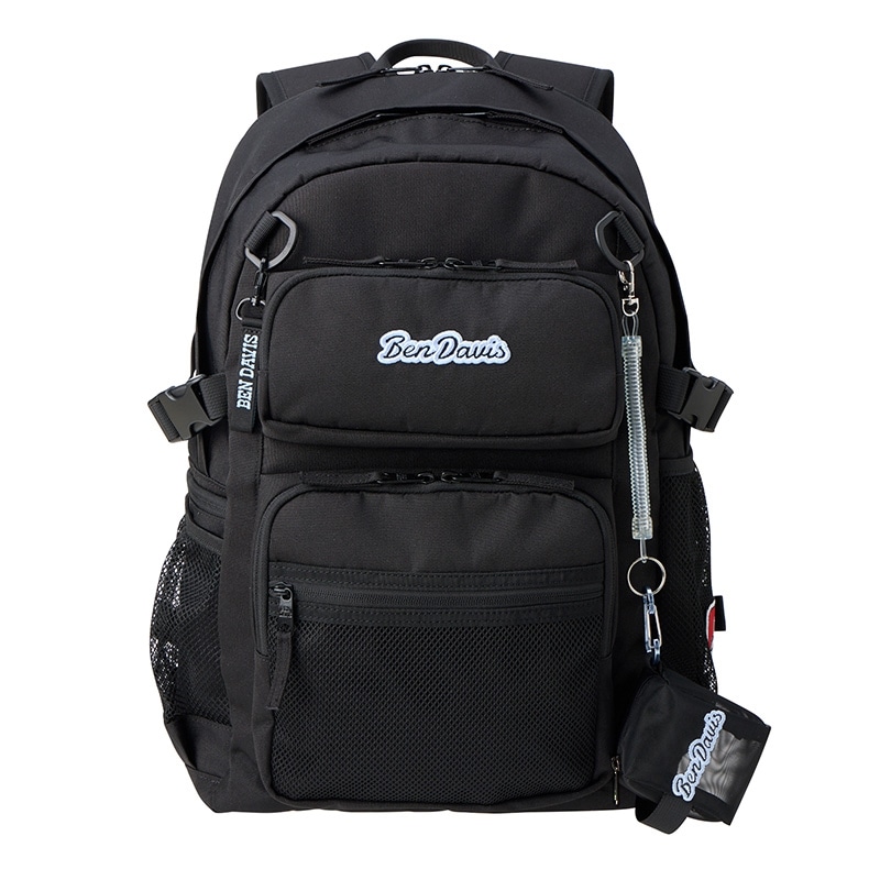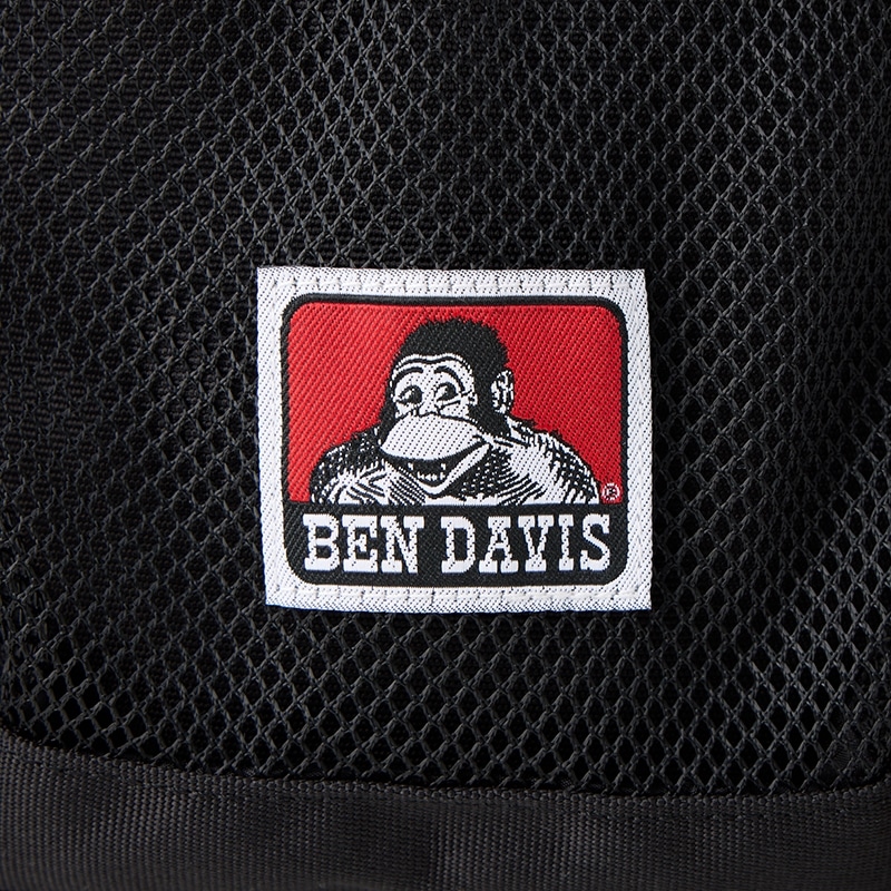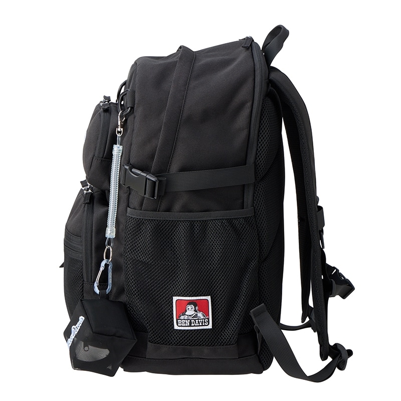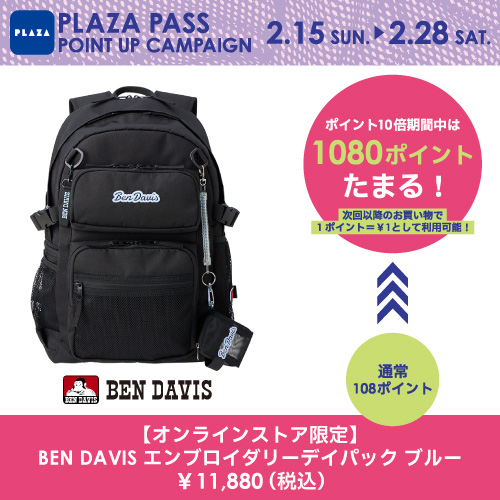 PLAZA オンラインストア限定!ブルーのロゴ&内布がアクセントになった「BEN DAVIS(ベン デイビス)」のデイパックが登場!大きめサイズで普段使いはもちろん、通勤・通学や旅行にもぴったりです。フロントやサイドにポケットがたくさんついているので、小物の収納に便利。チャーム代わりになるメッシュキューブのミニポーチ付きです。