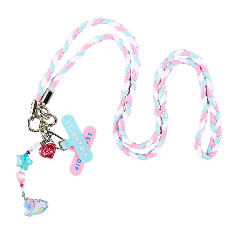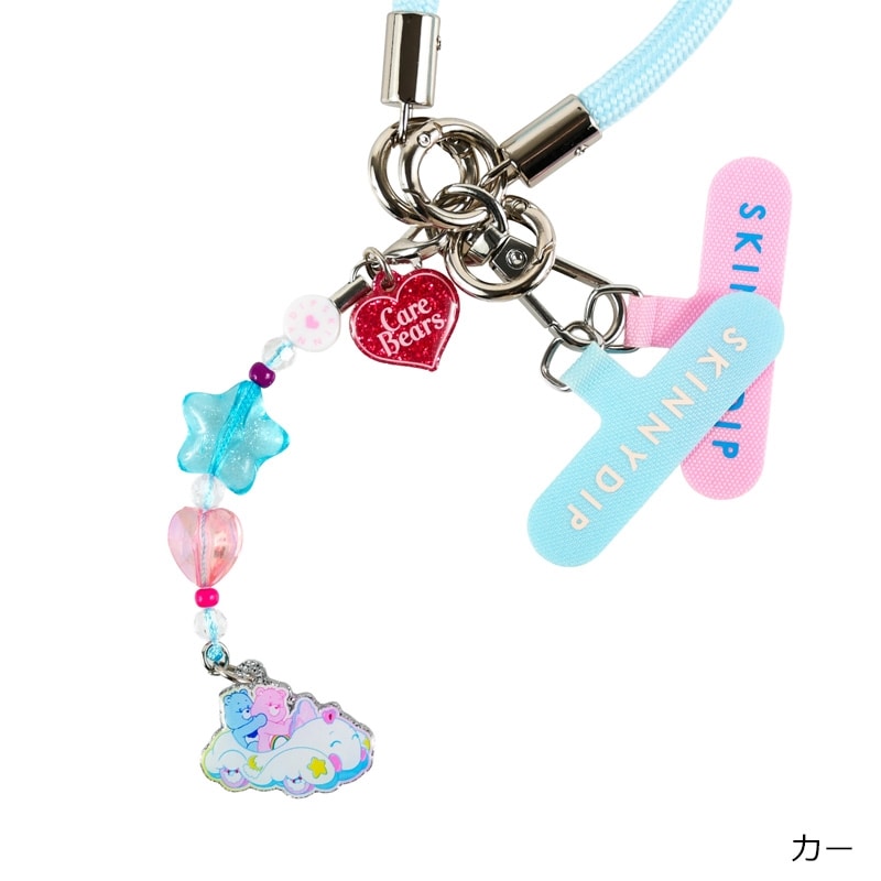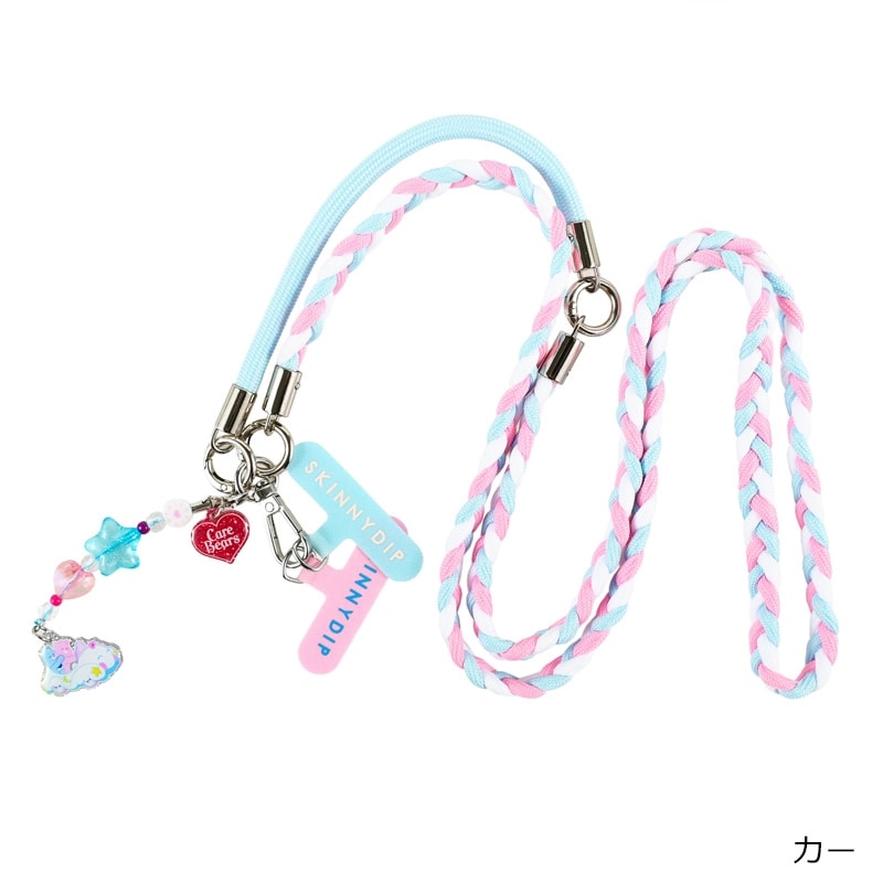 PLAZA限定!ロンドン生まれのファッション雑貨ブランド「SKINNYDIP(スキニーディップ)」とケアベア™がコラボレーションしたショルダーストラップ。ケアベアたちのかわいいチャーム付きです。デザイン色鮮やかなロープは、アジャスターで自由に長さ調節、脱着ができ、首掛けや肩掛けなど3Wayタイプでご使用いただけます。