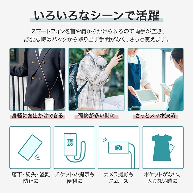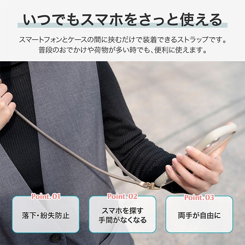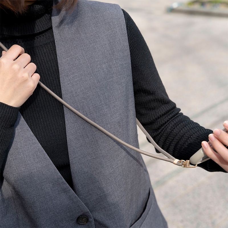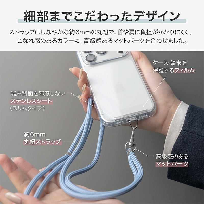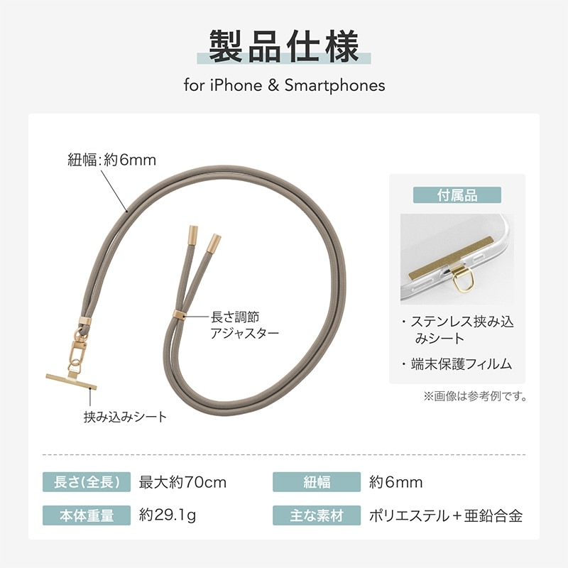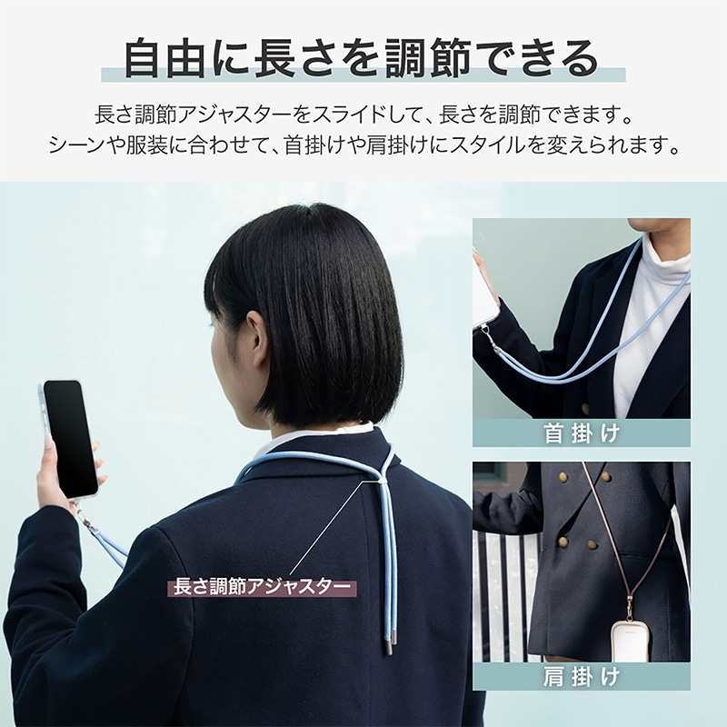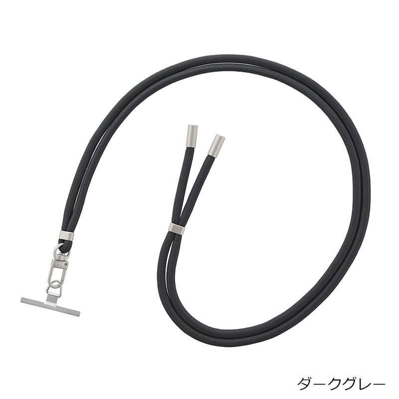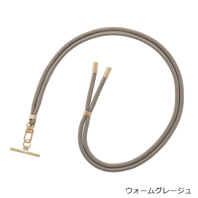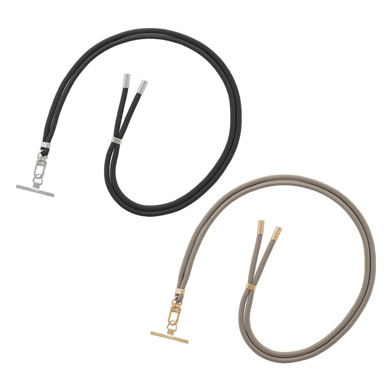 丸紐タイプのマルチストラップです。細身で丈夫なステンレス素材の挟み込みシート付き。アジャスターがあるため、首掛けや肩掛けなどお好みの長さに調整できます。高級感のあるマットパーツと落ち着いたカラーで大人でも使いやすいアイテムです。