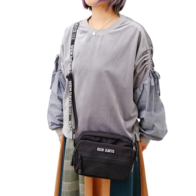 たっぷり入るメイン収納に、3つの外付けポケット付きで実用性抜群。ロゴ入りのテープがアクセントになったショルダーバッグです。メイン収納はダブルジップで両側から開閉が可能。コーディネートを選ばず、ユニセックスで使えるシンプルデザインが魅力です。サイドにあしらったブランドロゴワッペンがアクセントに。ベルトを取り外せば、ポーチとしても使えます。