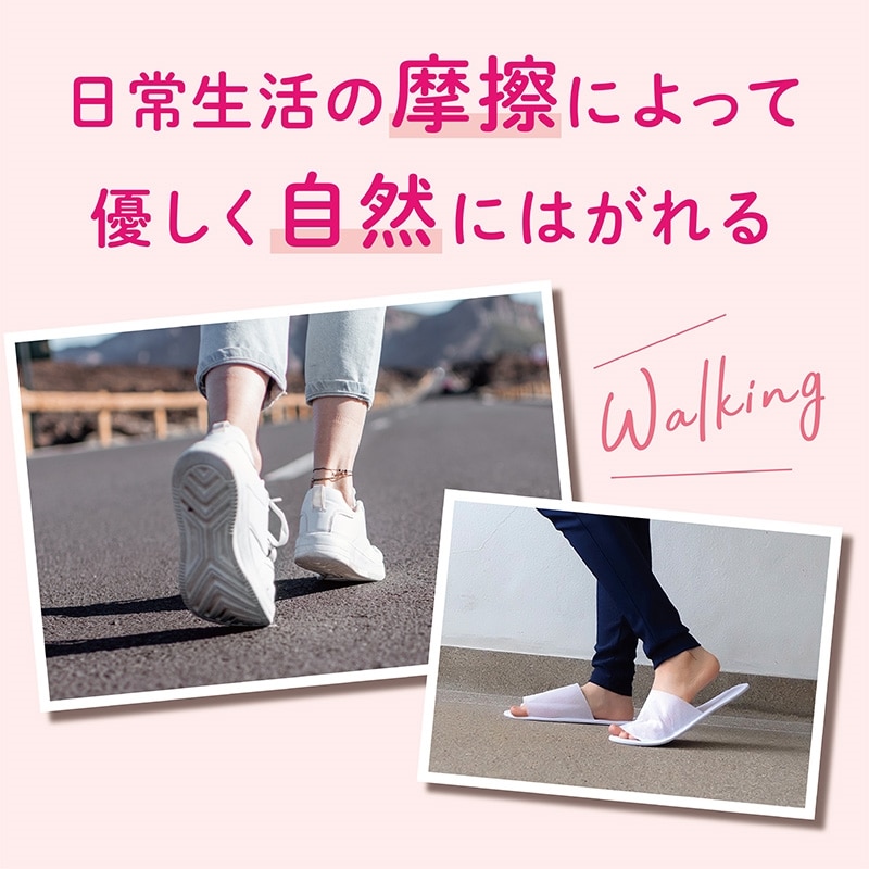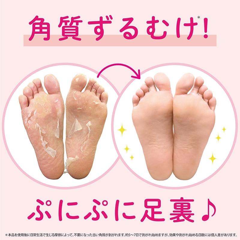 角質柔軟剤の入った足袋を1~1時間半履くだけ。約5日~7日で足裏の古い角質の表面が乾燥しはじめ、歩行等による摩擦により角質がポロポロと剥がれだします。