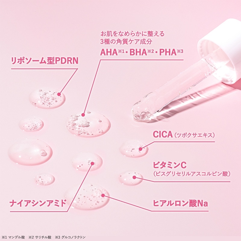 角質ケアと保湿ケアを同時に叶える導入美容液です。AHA(マンデル酸)・BHA(サリチル酸)・PHA(グルこのラクトン)の3種の角質ケア成分が古い角質や皮脂汚れをやさしく除去し、なめらかな肌へ導きます。PDRN(※1)をリポソーム化して配合し、肌にうるおいを与えながら整肌をサポート。さらに、ナイアシンアミドやCICA(※2)、ヒアルロン酸Naなどの美容保湿成分を贅沢に配合し、角質ケア後の肌をしっとり保ちます。