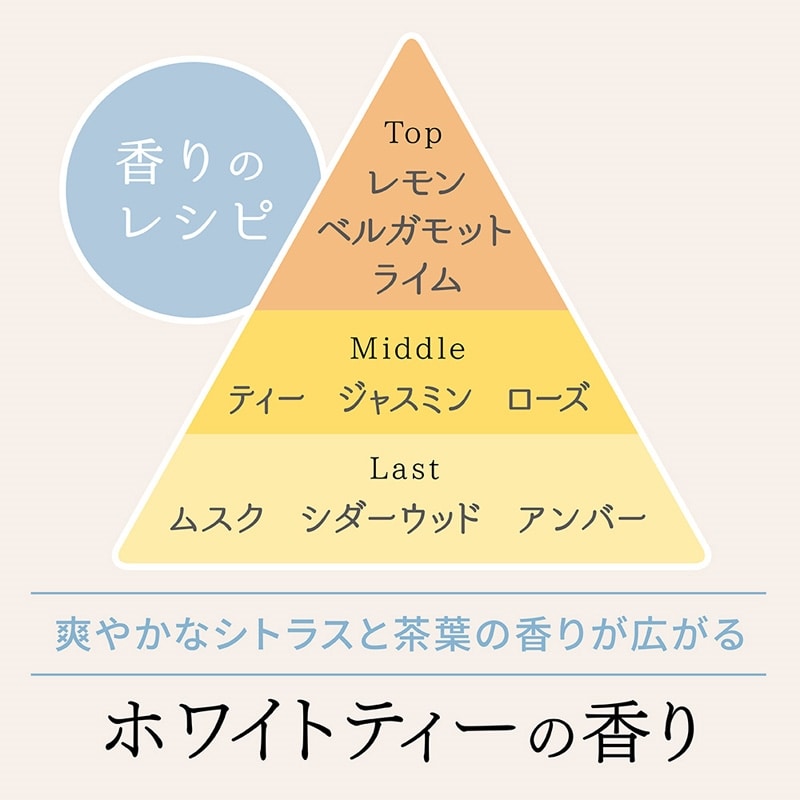 ふんわり軽い香り立ちで日常使いにピッタリな、ホワイトティーの香りのボディミスト。さわやかなシトラスと茶葉の香りが重なり合う、アフタヌーンティーを彷彿とさせる上品な香りです。シトラス~フローラル~ムスクへと移り変わる香りの変化をお楽しみください。