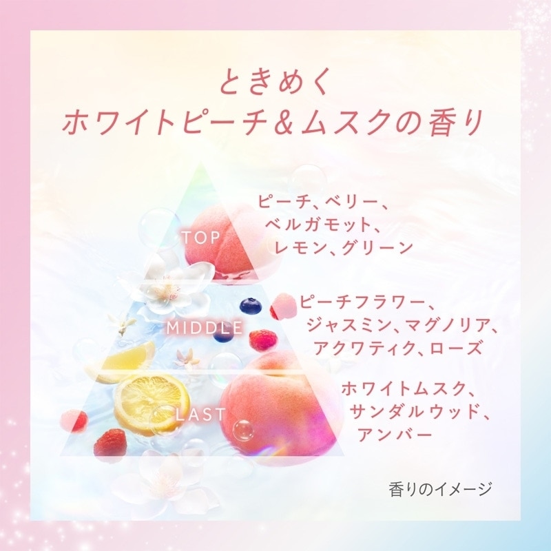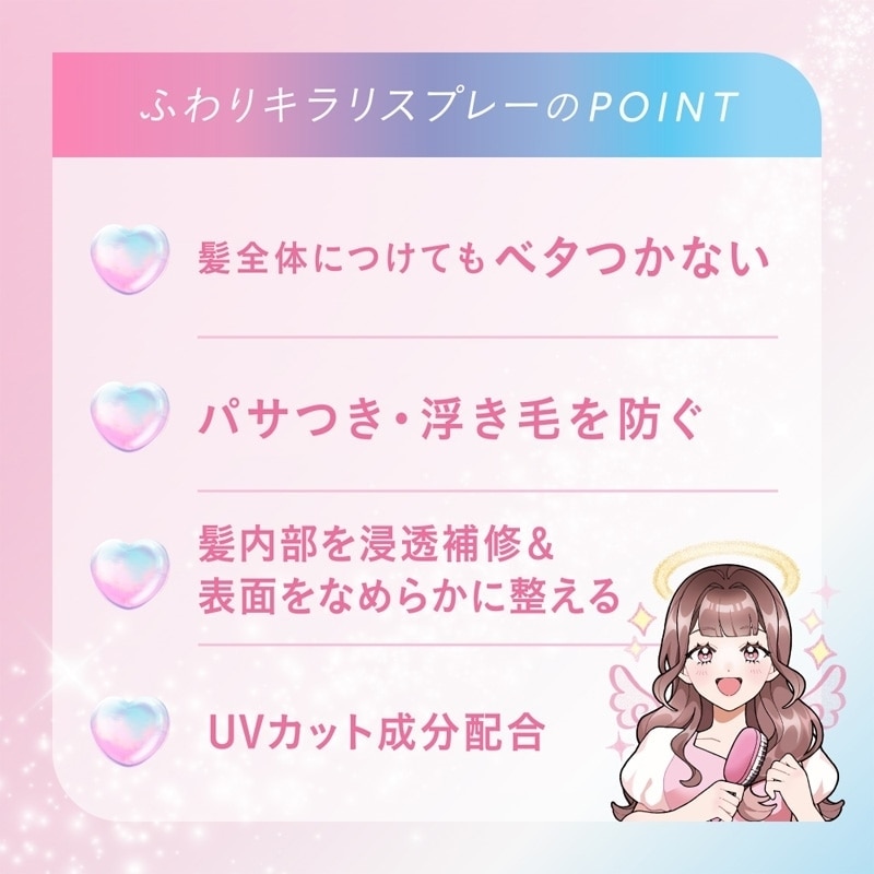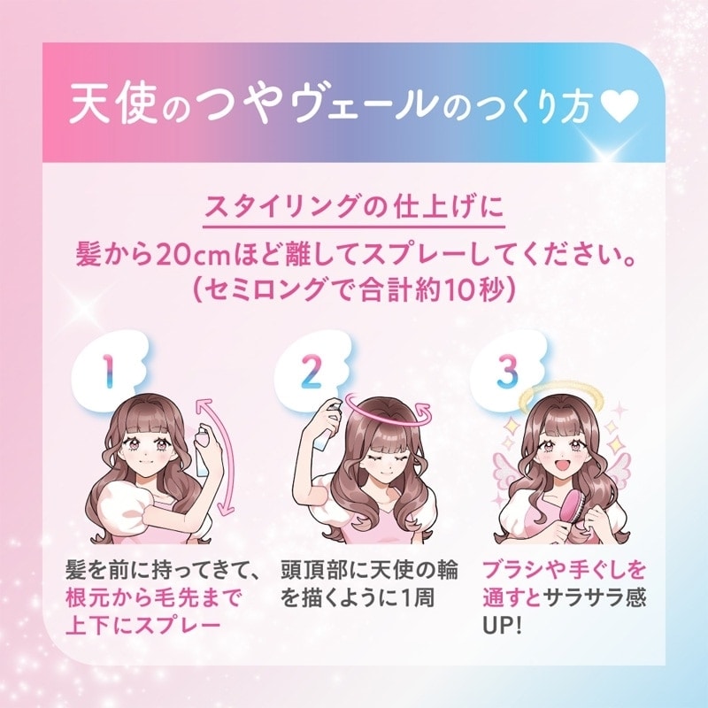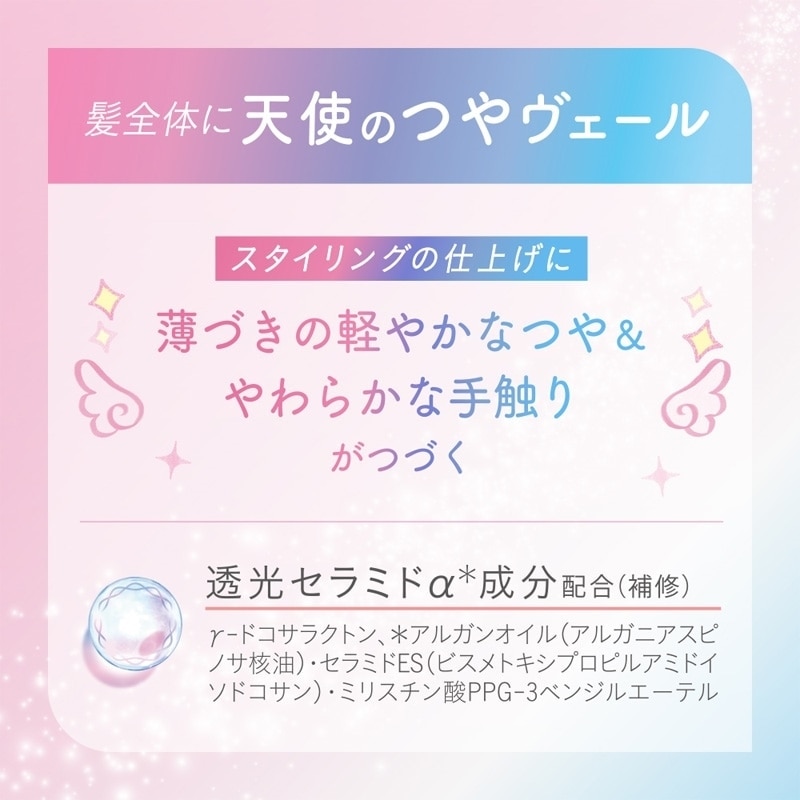 2026年4月17日(金)までPLAZA他2社先行販売!お試しや携帯用に便利なミニサイズ。根元から毛先まで髪全体を整えて、天使のつやベールをまとえるヘアトリートメントスプレー。スタイリングの仕上げに使用することで、まるでサロン帰りやトリートメント直後のようなサラツヤの仕上がりに◎。ホワイトピーチ&ムスクの香り。