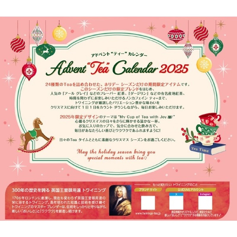 毎年人気!300年の歴史を誇る、英国王室ご用達紅茶「TWININGS(トワイニング)」から、アドベントティーカレンダーが今年も登場です。 クリスマスまでカウントダウンしながら、このシーズンだけの限定ブレンドをはじめ、人気の紅茶やノンカフェインティー全24種類が楽しめます♪自分へのごほうびや、ギフトにもおすすめです。