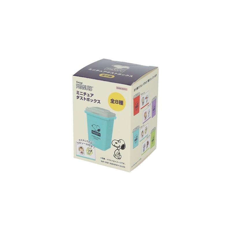 並べてかわいいミニチュアサイズのダストボックス型の小物入れ。机の上のちょっとした整理に便利なアイテムです。全8種の中からランダムで1種入り。本体に貼れるプチシール付き!