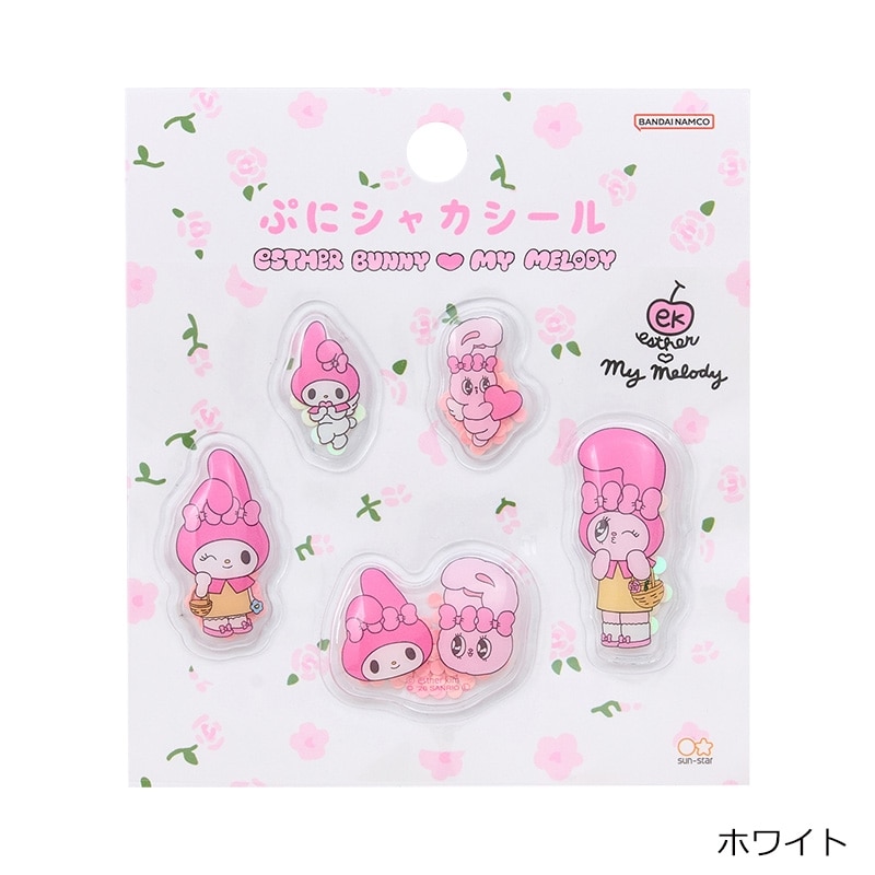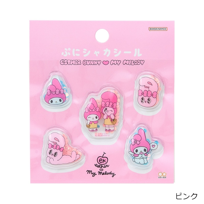 世界中で愛されている可愛いウサギのキャラクター「Esther Bunny(エスターバニー)」とサンリオの人気キャラクター「マイメロディ」が夢のコラボ!ポップでガーリーな世界観がぎゅっと詰まったシャカシャカ楽しいシールです。ぷにぷにカプセルの中でスパンコールがキラキラ輝いて、スマホケースなど身の回りのアイテムをかわいくデコレーションできます。