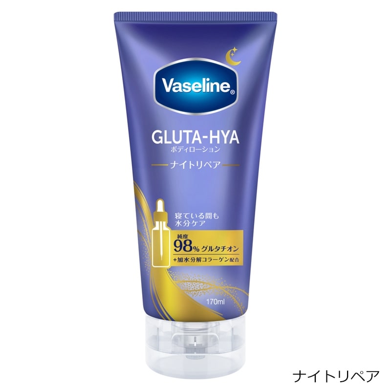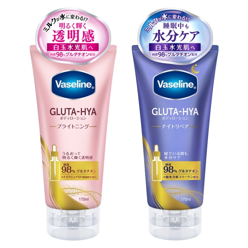 「Vaseline(ヴァセリン)」のミルクのような質感がひと塗りですっと水のように変化するボディローション。グルタチオン(※1)と4種のヒアルロン酸(※2)がお肌にうるおいを与えて肌のキメを整えくすみ(※3)をケアしもっちり肌へ。ナイアシンアミド(※1)配合でうるおって輝くブライトニングと、加水分解コラーゲン(※1)配合で寝ている間も水分ケアするナイトリペアの2種。