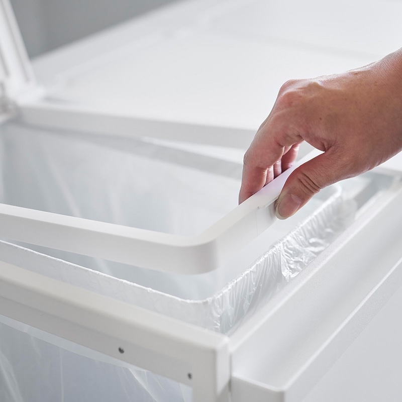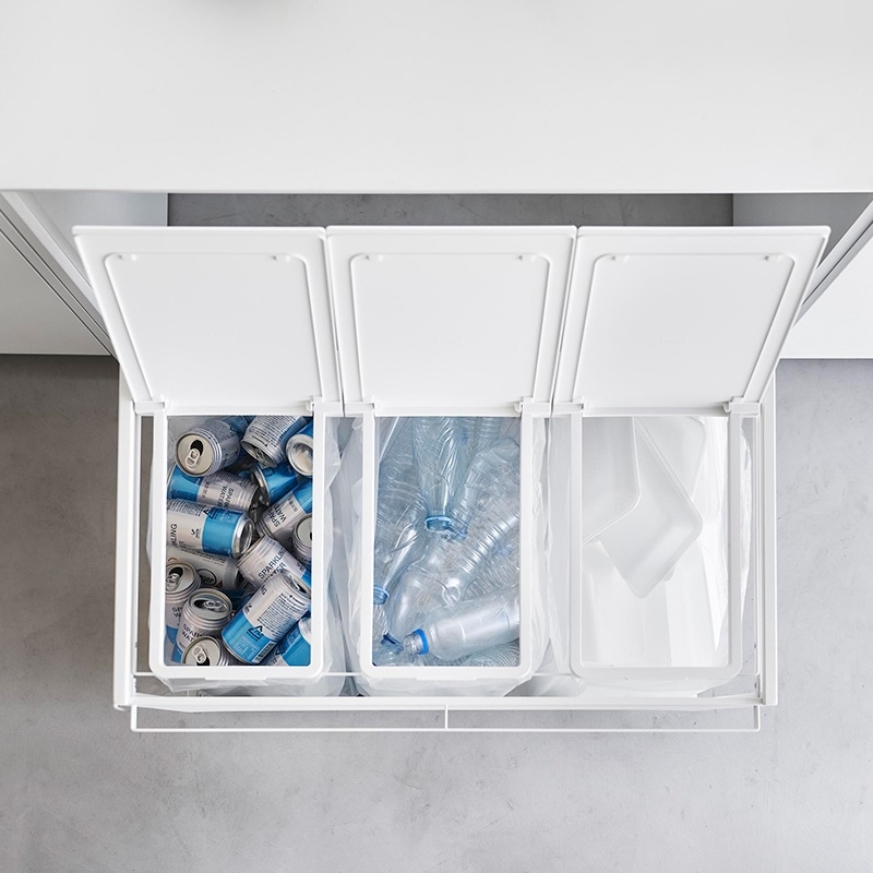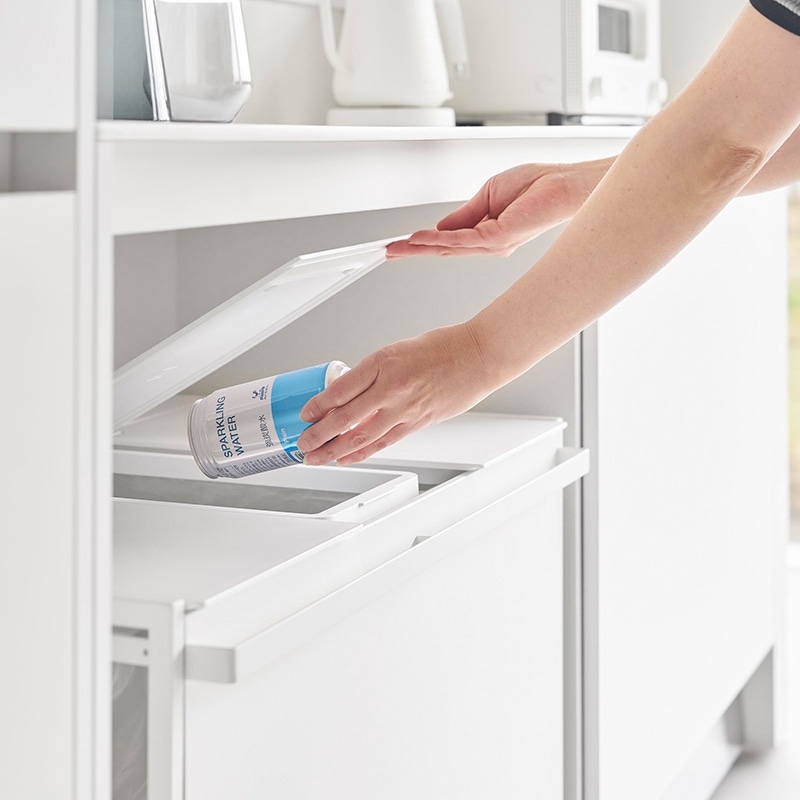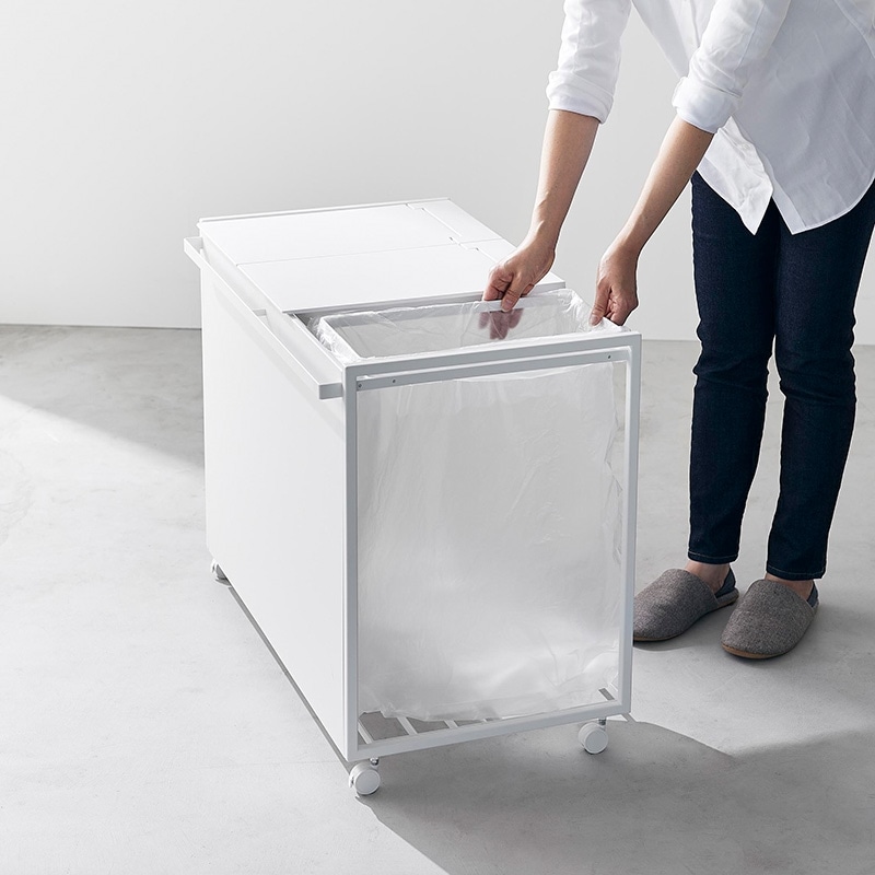 瓶・缶・ペットボトル・プラスチックなどのゴミを3分別できるダストワゴンです。前面の目隠しプレートと蓋で中のゴミを隠して、カウンター下のスペースに収納できます。キッチン横に置いてもサッとゴミを捨てることができて便利。インテリアになじむスタイリッシュなデザインです。蓋は片手で簡単に開けることができ、ハンドルとキャスター付きで移動がスムーズ。ハンドルにはゴミ袋やタオルなどを掛けることもできます。ゴミ袋の交換は蓋を外して手前に引くだけで簡単です。底面にはゴミ袋をストックしておくこともできます。