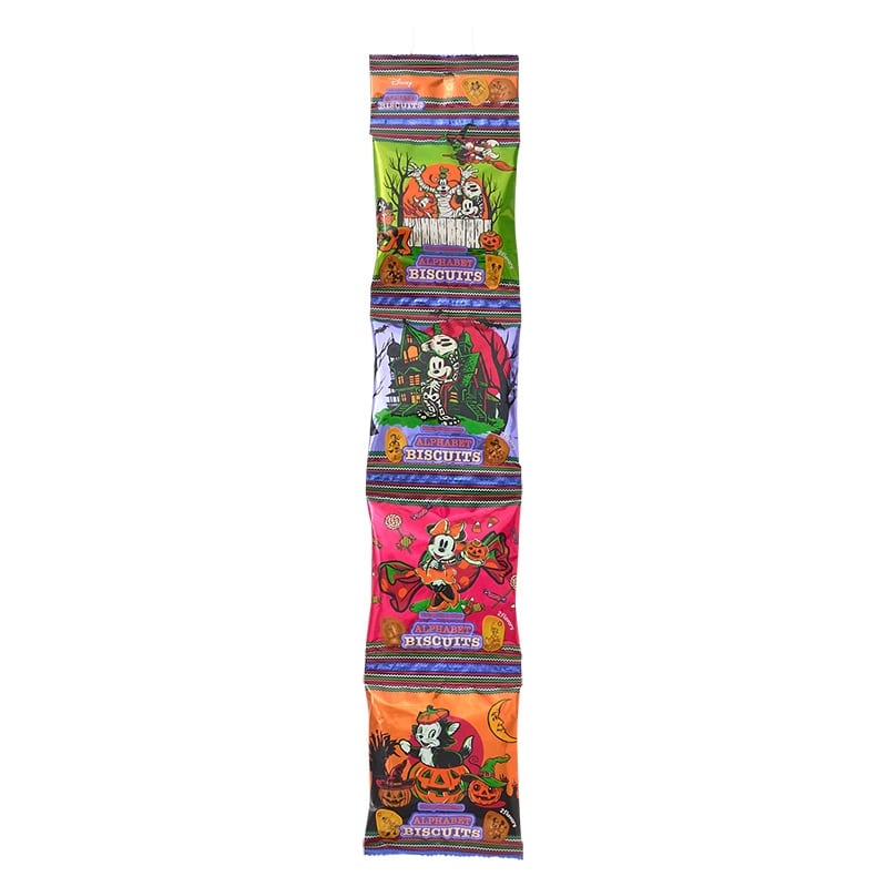 ミッキーたちのハロウィンのデザインがキュートなビスケットバッグ。1バッグの中に、プレーン味とココア味の2フレーバーが楽しめます。ビスケットには仮装したミッキーたちと、アルファベット1文字がプリントされています。切り取り線入りで配りものにも◎のアイテム。