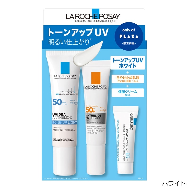PLAZA限定の数量限定アイテム!「ラロッシュポゼ」で人気のトーンアップ(※)UV下地に、お値段そのままで日やけ止め乳液と保湿クリームのミニサイズが付いてくるお得な限定セット。UV下地は、3色からお好きなカラーを選べます。乳液・UV下地ともにSPF50+ PA++++。日やけ止め乳液は、汗に強い処方なのにライトな使用感が魅力。