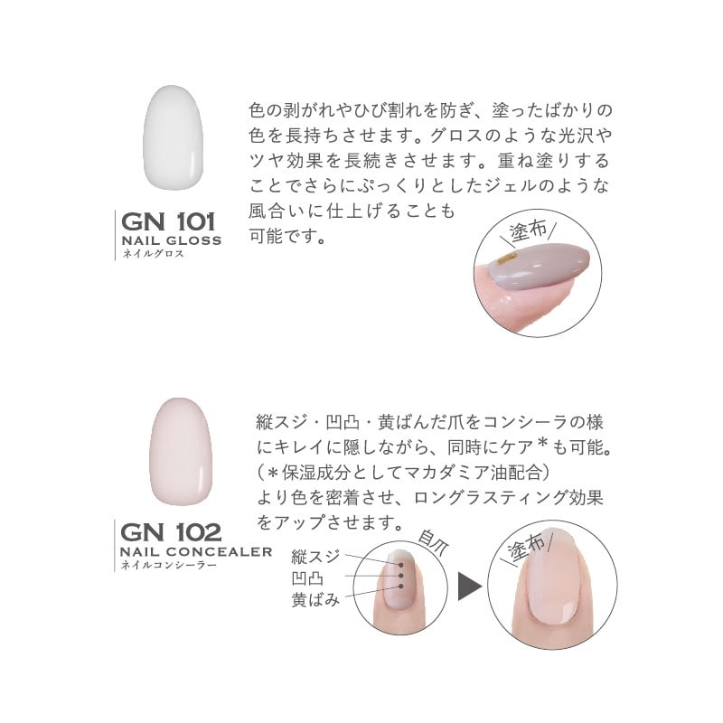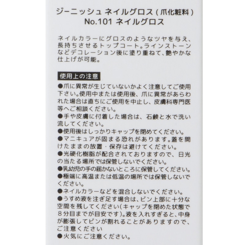 ジーニッシュのマニキュアを使うなら欠かせない、トップコートとして使えるネイルグロスです。お気に入りのマニキュアを塗った後に使うことで、ジェルネイルのようなぷっくりとした厚みとツヤをプラス。すぐに乾いて太陽光などで徐々に硬化していくので耐久性もアップします。
