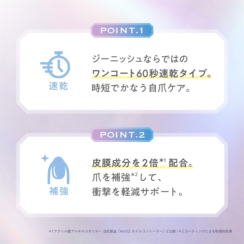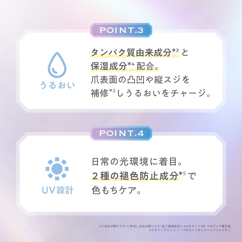 エイジングケア(※1)しながらキレイ見せも叶える、60秒速乾ネイルケアコート。コーティングにより爪を衝撃から守りつつ、タンパク質由来成分(※2)や保湿成分(※3)が健やかで美しい爪作りをサポート。表面の凸凹や縦スジを補修(※4)して美爪へと導きます。好みに合わせて選べるカラーバリエーション。