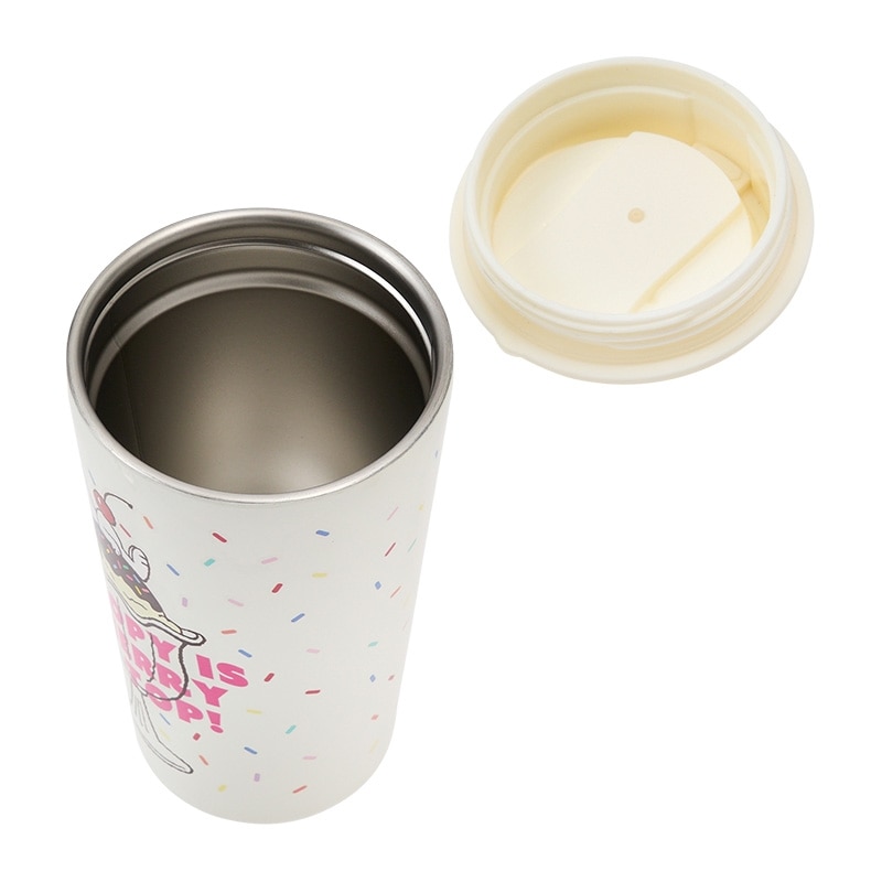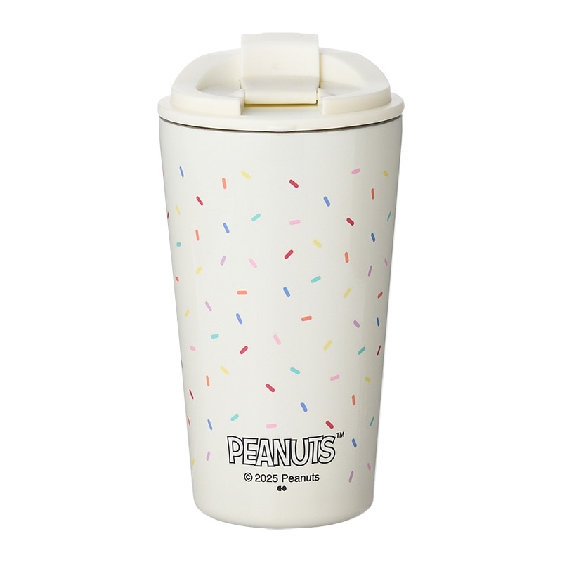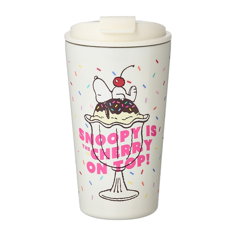 PLAZA限定!保温・保冷ができるフタつきのステンレスタンブラー。チェリーとアイスの上で寝転ぶスヌーピーがとってもかわいいデザインです♪季節を問わず、あたたかい飲み物も冷たい飲み物も、ちょうどいい温度で長く楽しめます。コンビニのコーヒーカップをそのまま入れて使えるので、持ち歩きやすくとても便利。フタ付きなのでこぼれにくく、デスクワークやお出かけ先でも安心です。