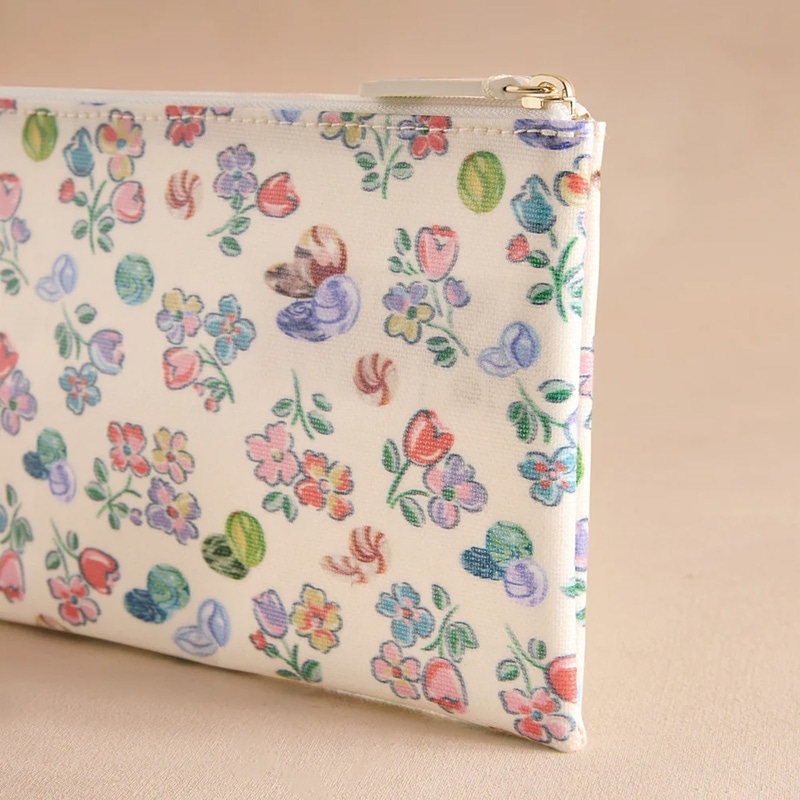 お財布としても、ポーチとしても使える、フラットでコンパクトなジップドパース。ポケットやバッグに収納しやすいすっきりとしたシルエットが魅力です。繊細な手描きのビー玉(マーブル)と、生き生きと咲き誇る花々が組み合わさった華やかなプリント施されています。