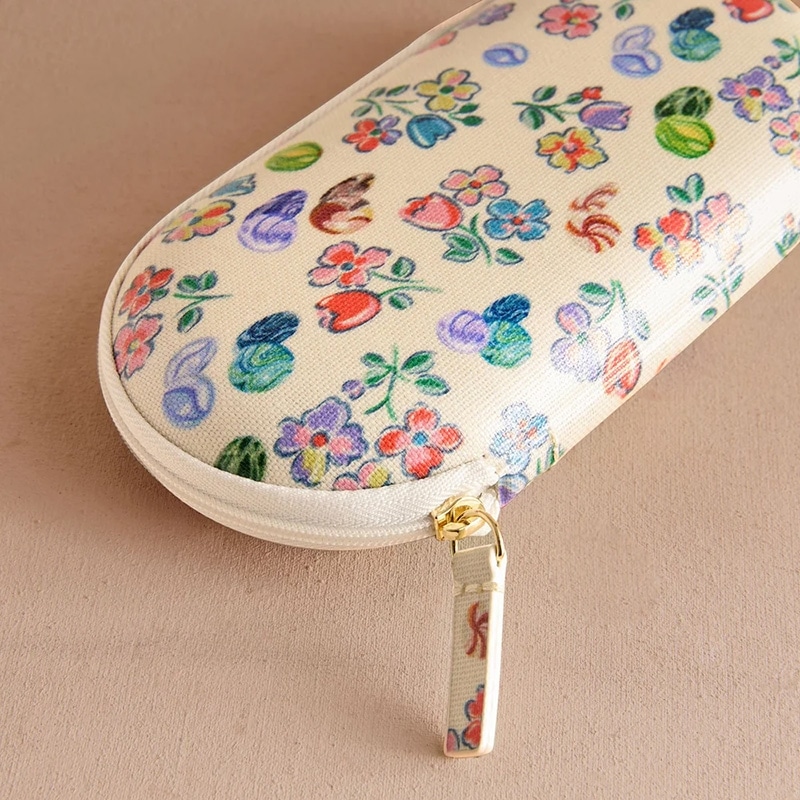 コーティングされたコットン生地のメガネケース。耐久性があり、メガネやサングラスを衝撃から守ってくれます。繊細な手描きのビー玉(マーブル)と、生き生きと咲き誇る花々が組み合わさった華やかなプリント施されています。