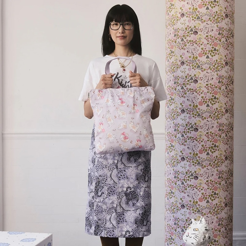 丈夫なリサイクルポリエステル製の折りたたみ式トートバッグ。耐久性が高く、地球にも優しいリサイクルポリエステルを使用。使わないときは折りたたんでバッグに入れて、持ち運べる便利なアイテムです。キャット&マウスというクラシックなゲームをモチーフにした、花柄の猫と水玉模様のネズミが特徴的な手描きのヴィンテージ風プリントです。
