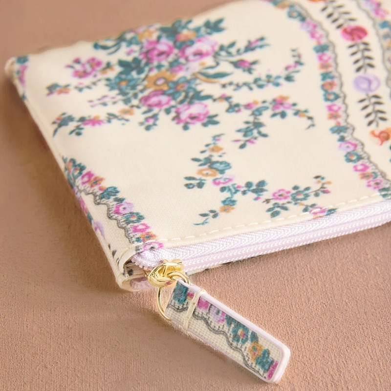お財布としても、ポーチとしても使える、フラットでコンパクトなジップドパース。ポケットやバッグに収納しやすいすっきりとしたシルエットが魅力です。このプリントは宝石のような鮮やかな色合いで描かれた、花と葉が連なるように織りなされた模様が印象的です。