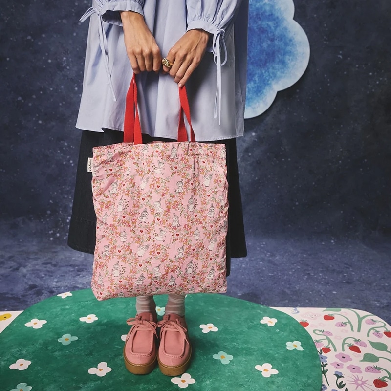 丈夫なリサイクルポリエステル製の折りたたみ式トートバッグ。耐久性が高く、地球にも優しいリサイクルポリエステルを使用。使わないときは折りたたんでバッグに入れて、持ち運べる便利なアイテムです。リトルミイの名前にちなんでアーカイブのディッツィー(小花など小さなモチーフ柄のこと)プリントを組み合わせたLittle My Ditsy。明るく元気な性格のリトルミイは「怒るのもいいこと」というメッセージを伝えています。