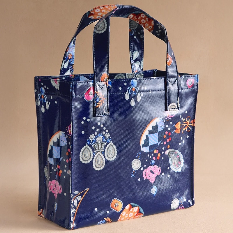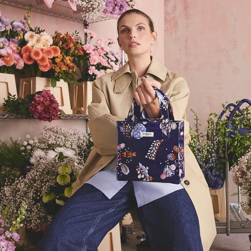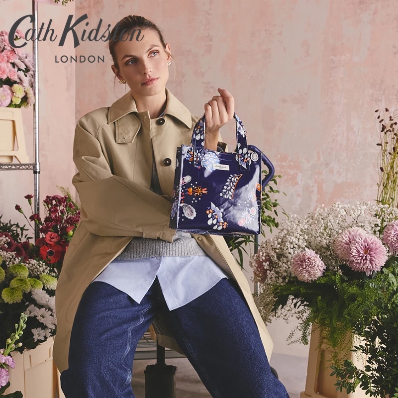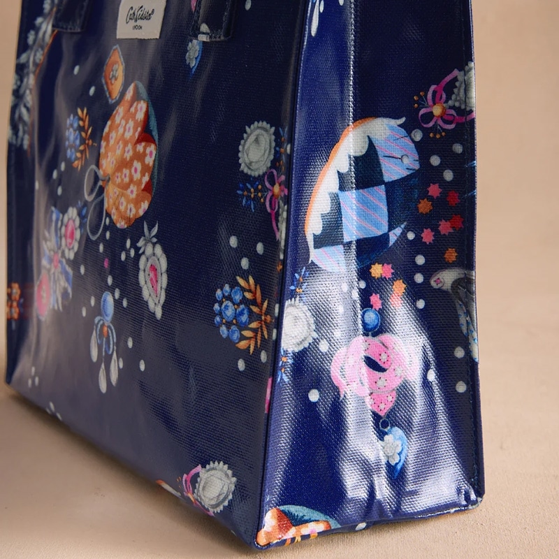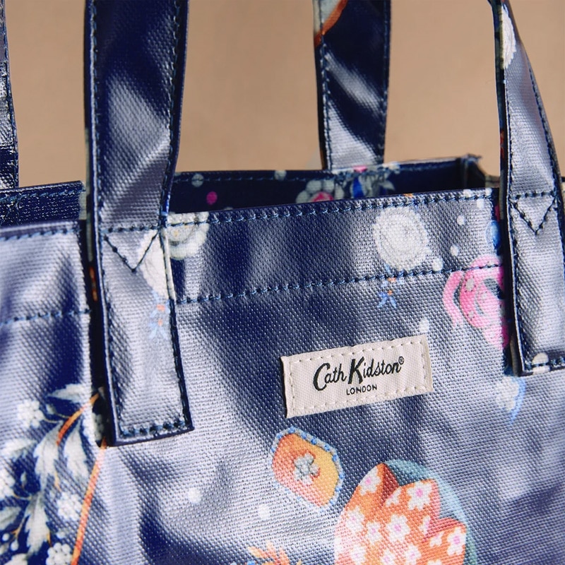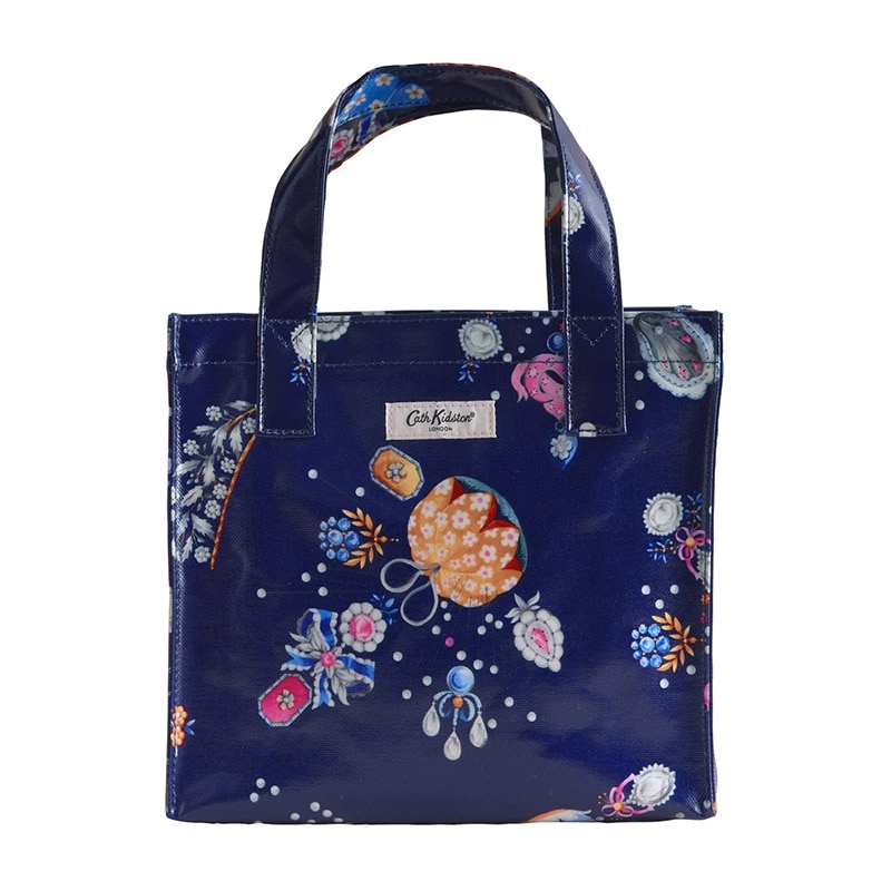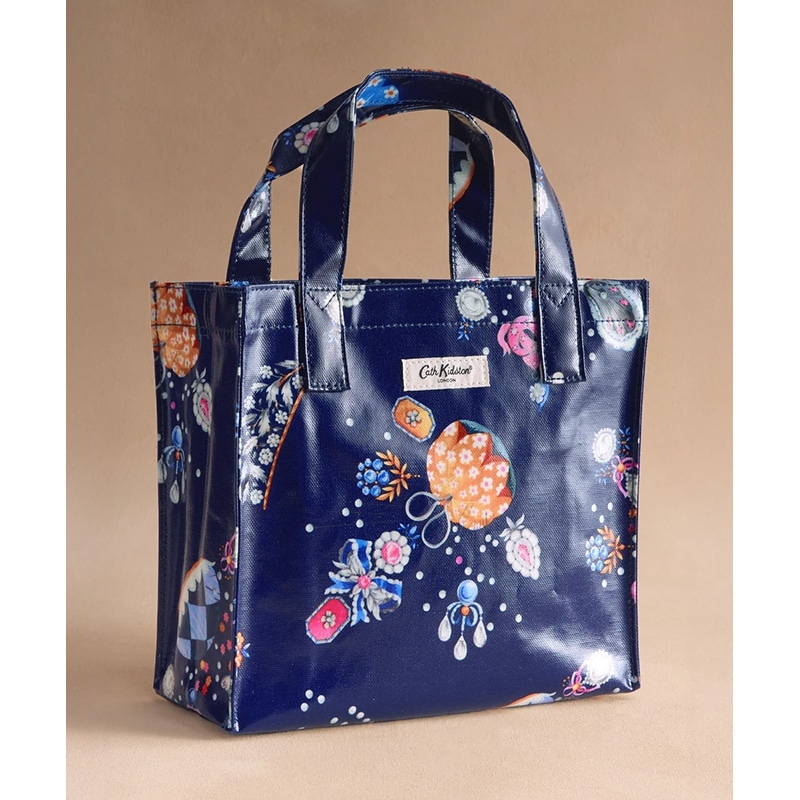Cath Kidstonで人気のブックバッグの使いやすいスモールサイズ。特徴的なシルエットはそのままに、より小さく便利なサイズです。コーティングされた光沢のあるコットンは拭くことができ、お手入れも簡単です。洗練されたダークネイビーをベースに、宝石のようなチャームや花のアクセサリー、パールボタンなど、心ときめくモチーフを散りばめたLittle Treasuresプリント。