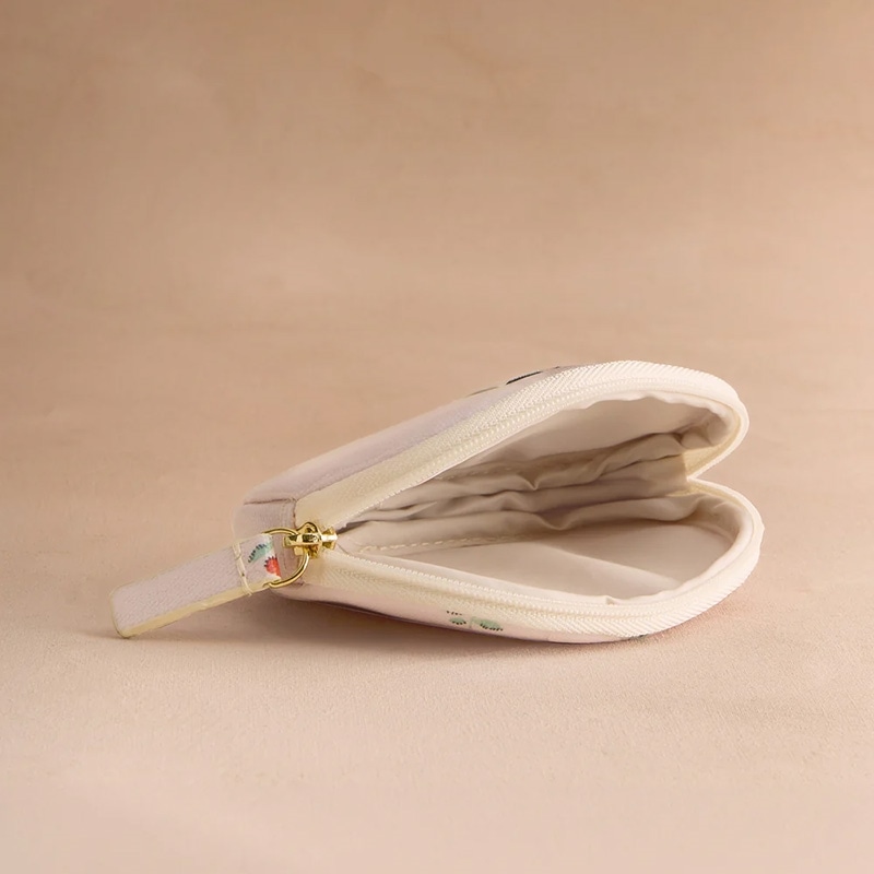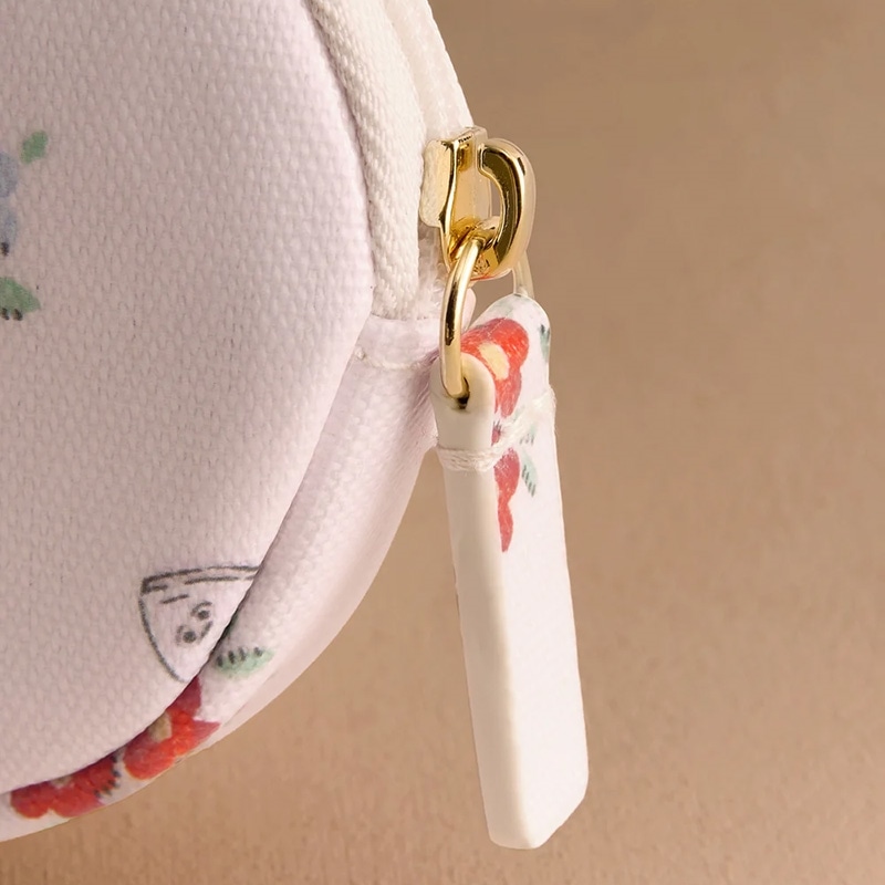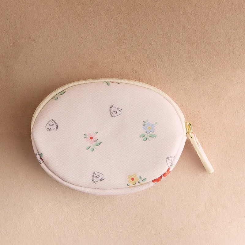 コーティングされたコットン製のオーバルコインパースは、小銭や鍵、小物など、こまごましたものを入れるのに最適です。アーカイブから復活したこの花柄は、柔らかなクリーム色をベースに、色とりどりの花々が可憐に散りばめられています。さらに、手描き風のハートボタンの縁取りと、ブランドを象徴するピンクのロゴがアクセントになったユニークなデザインが魅力。