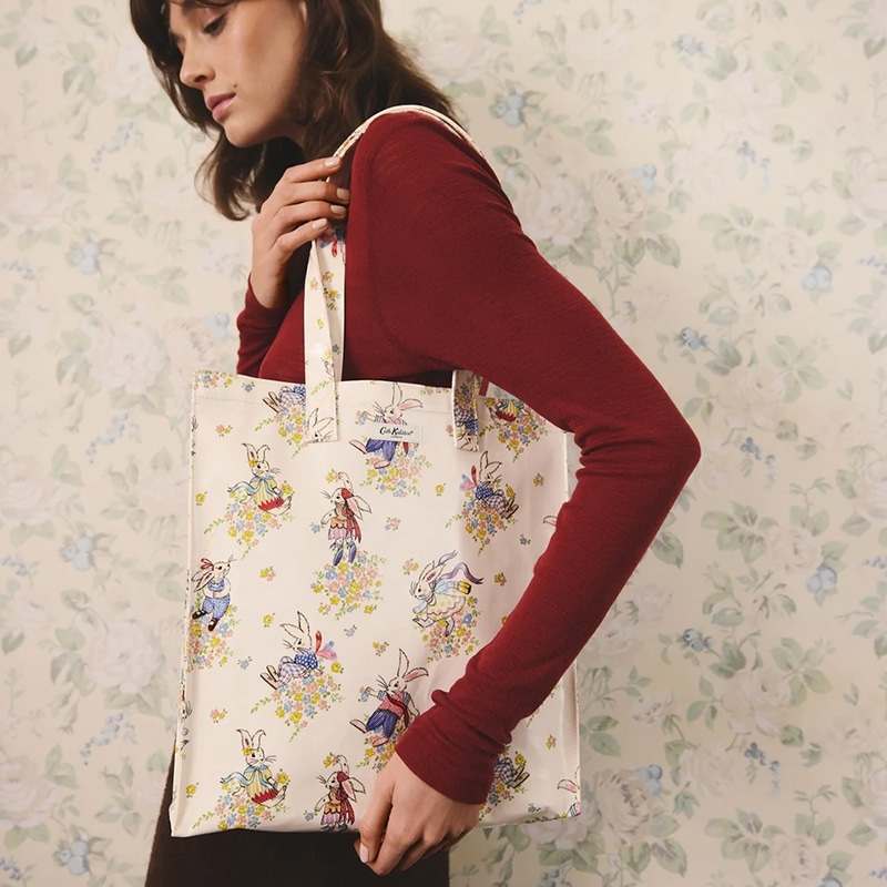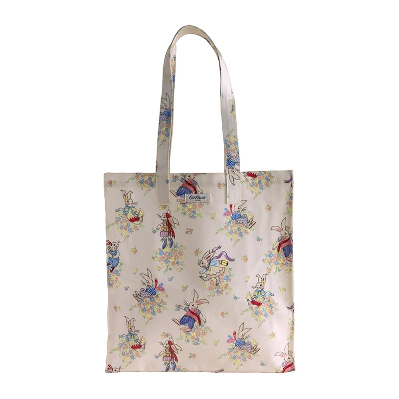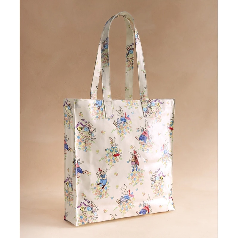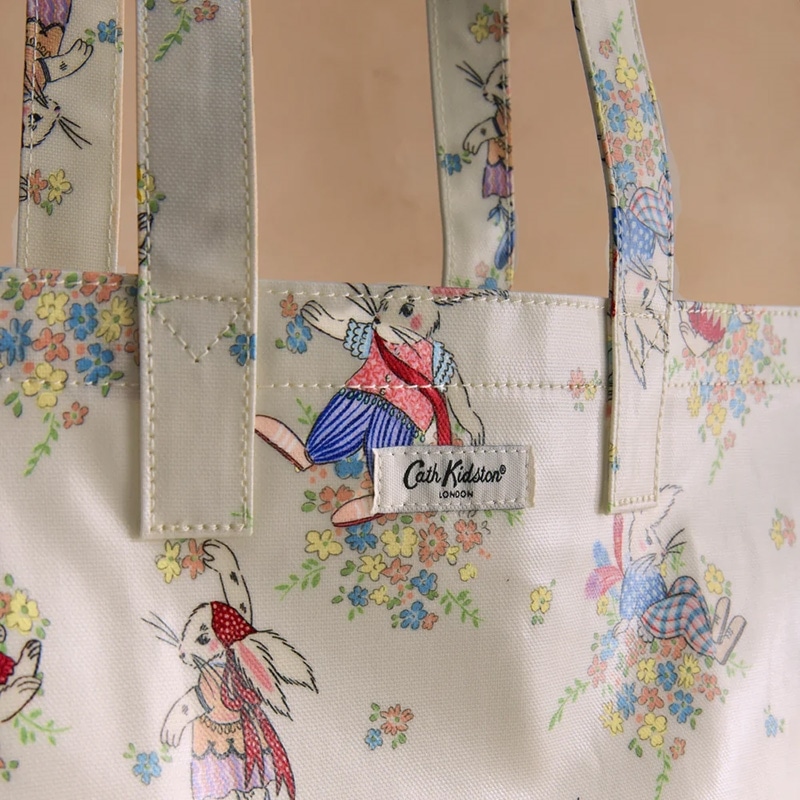 ラージブックバッグはCath Kidstonで最も人気のあるアイテムのひとつ。コーティングされたコットンの軽量ながらも耐久性のる素材で、使いやすいサイズのトートバッグです。内ポケット付き。ドレスを纏った愛らしいウサギがアーカイブから復活した花々に囲まれて思い思いに佇んでいます。日々の気分を明るくしてくれるような、かわいらしいプリントです。