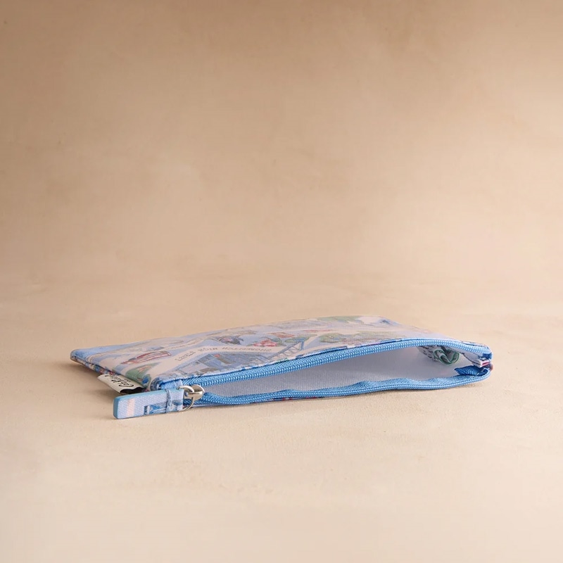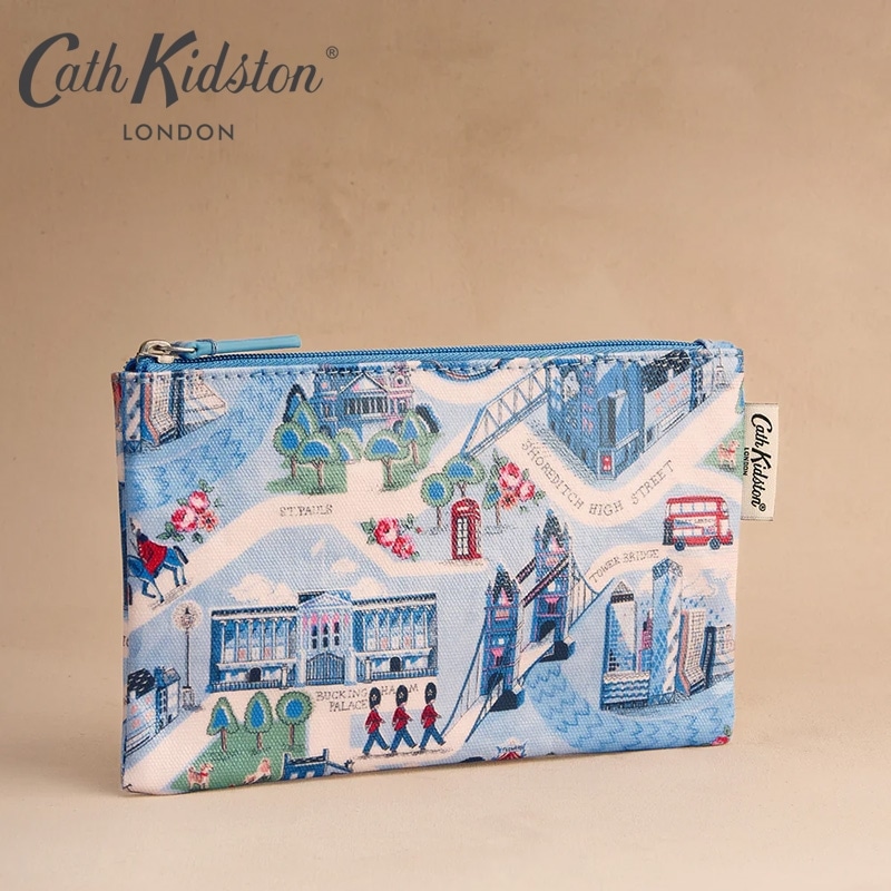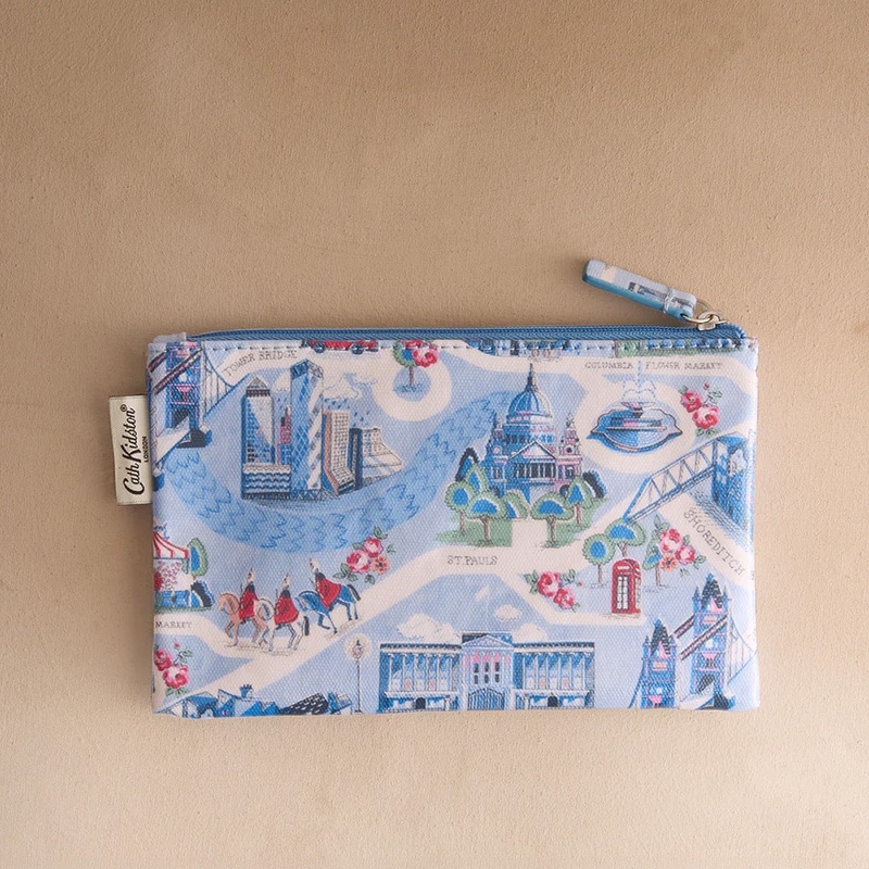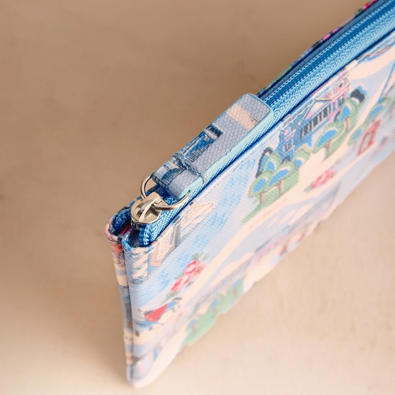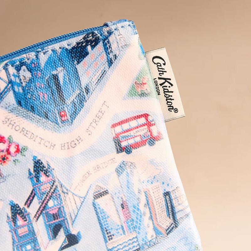 お財布としても、ポーチとしても使える、フラットでコンパクトなジップドパース。ポケットやバッグに収納しやすいすっきりとしたシルエットが魅力です。タワーブリッジや赤い2階建てバスといったロンドンの象徴的な景色を、ブランドの代名詞である繊細な花々と共に、美しいブルーのトーンで描き出しました。Cath Kidstonを代表するキャラクターたちも顔を覗かせ、街の魅力を余すところなく表現しています。