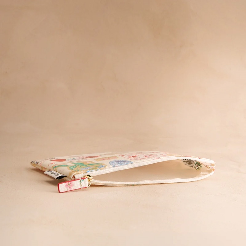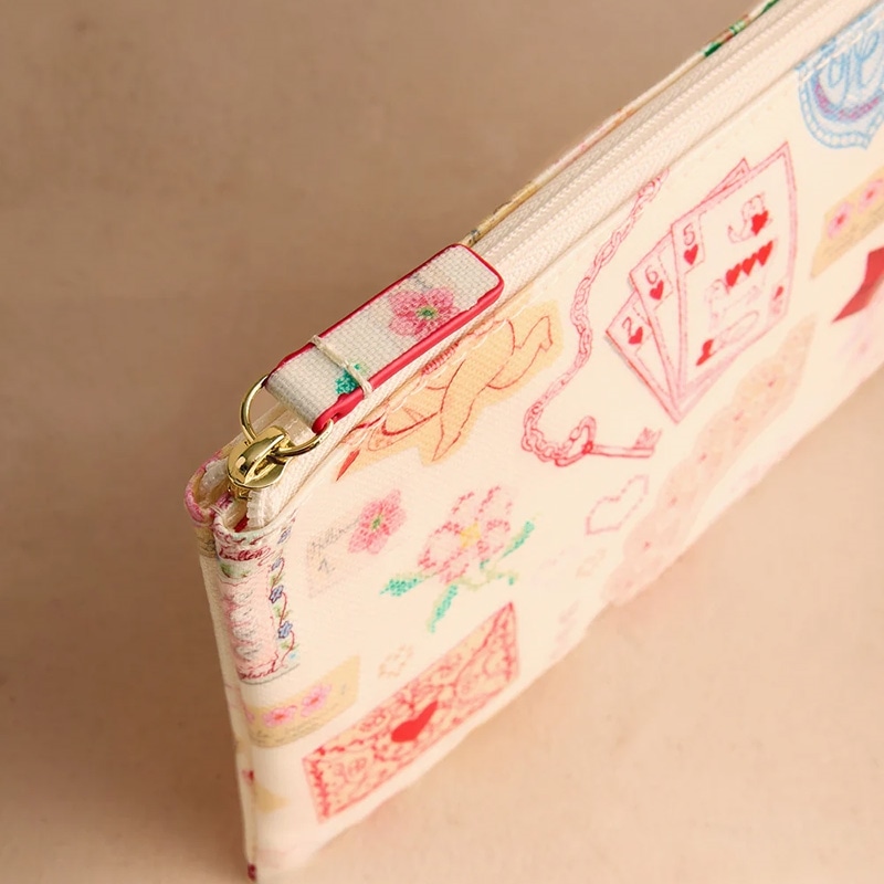 お財布としても、ポーチとしても使える、フラットでコンパクトなジップドパース。ポケットやバッグに収納しやすいすっきりとしたシルエットが魅力です。レースやラブレターのコレクションからインスピレーションを得たこのデザインには、キューピッドの矢、愛の手紙、花束、そしてトランプなど、遊び心あふれる「宝物」たちが贅沢に描かれています。どこか懐かしさを感じさせるモチーフが、温もりと愛に満ちた世界観を演出します。