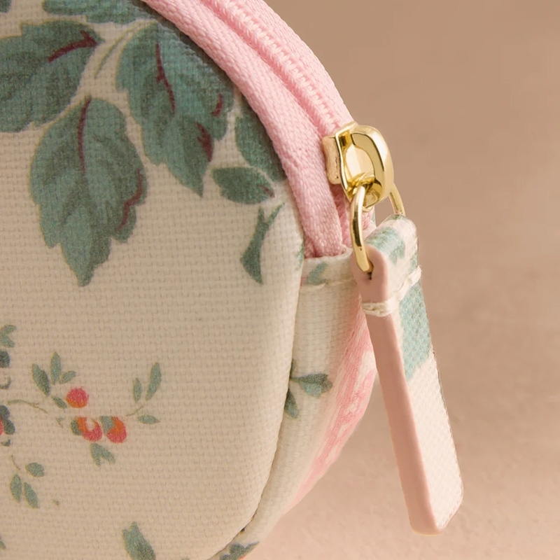 コーティングされたコットン製のオーバルコインパースは、小銭や鍵、小物など、こまごましたものを入れるのに最適です。アーカイブ柄からインスパイアされたHackney Roseプリントは、ヴィンテージ感漂うエレガントなデザイン。ピンクやコーラルの花々がロマンティックに咲き誇り、繊細なレースのハート型パッチがアクセントを添えています。