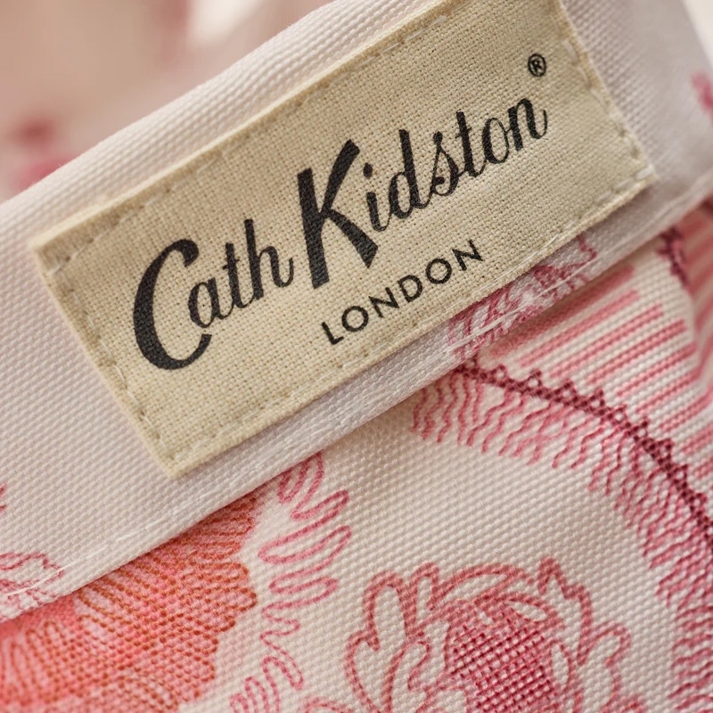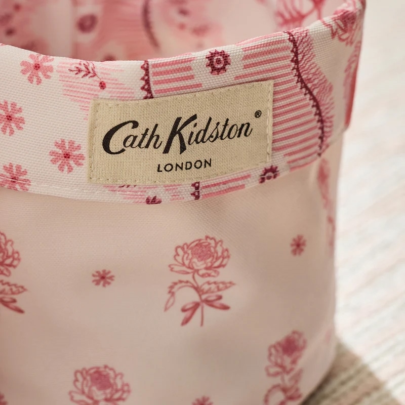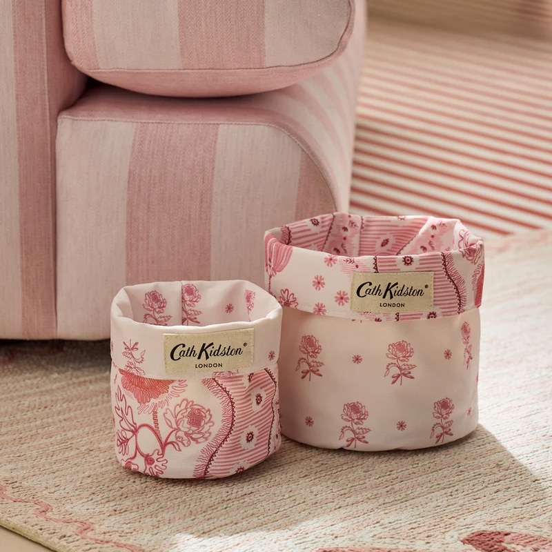 サイズ違いの2個セットです。内側と外側でプリントが異なり、お好みでリバーシブルに使用できます。このプリントは、かつてロンドンのイーストエンドで栄えたシルク織物産業への敬意を込め、細部まで愛情を込めて手描きされたもの。温かみのあるピンクのトーンの中に、エレガントな花のモチーフ、リボンやデコラティブ縁取りが描かれています。