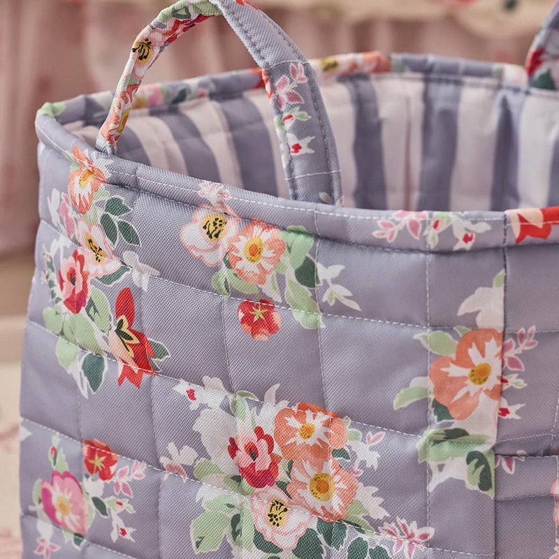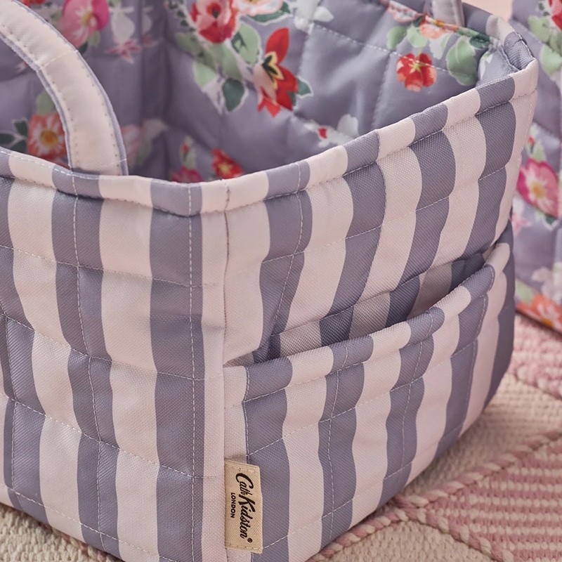 キルティング素材のストレージバッグ。サイズ違いの2個セットです。内側と外側でプリントが異なり、ポケットを内側にしたり外側にしたり、お好みでリバーシブルに使用できます。プリントは、Cath Kidstonの伝統的アーカイブからインスピレーションを得たもの。柔らかなライラックカラーをベースに、コーラル、クリーム、ピンクといった鮮やかな花々が咲き誇り、新時代を感じさせるフレッシュでモダンな表情に仕上げました。