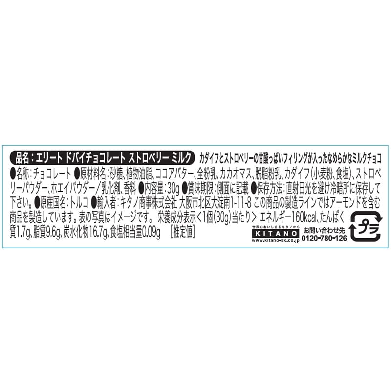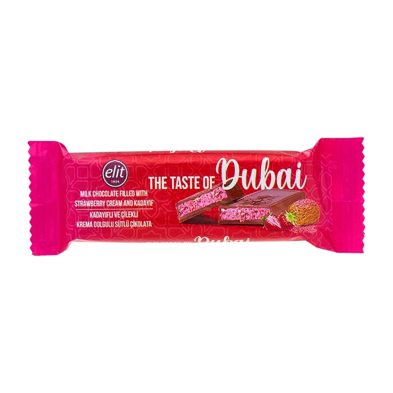 PLAZA限定! 人気の「ドバイチョコレート」がトルコのチョコレートブランドエリート社からラインアップ。カダイフ(細い麺状の生地)とストロベリーの甘酸っぱいフィリングが入ったなめらかなミルクチョコレートです。