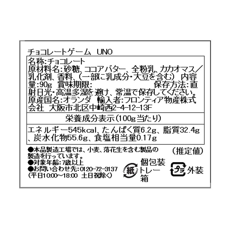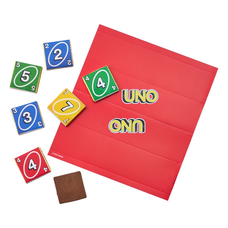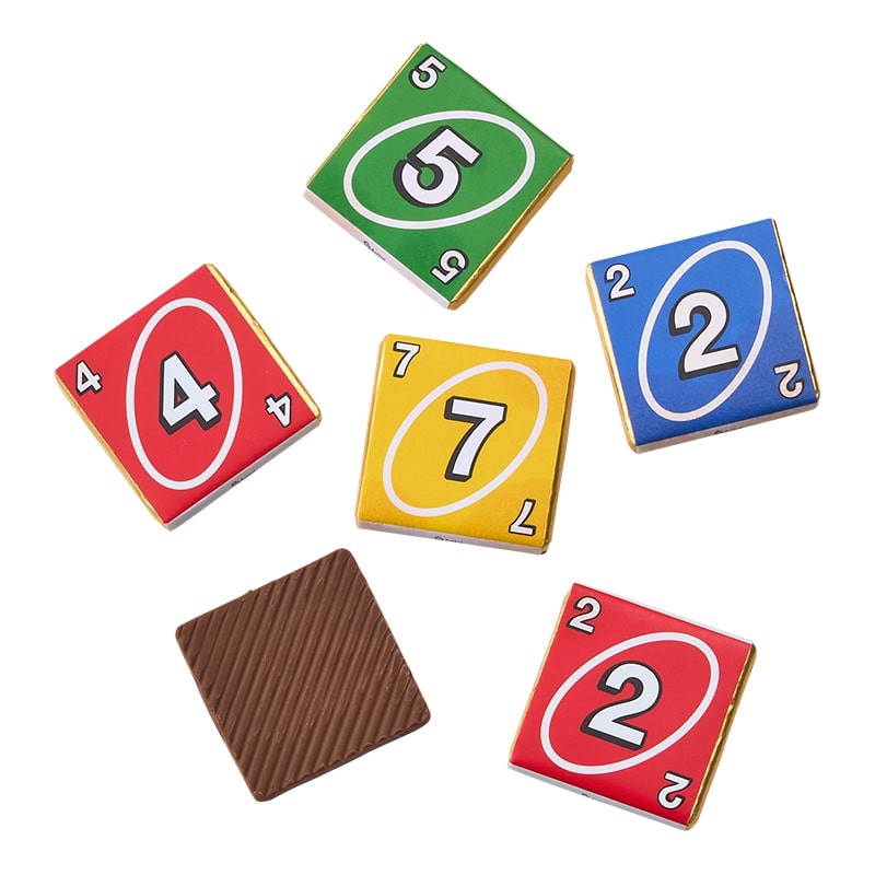 PLAZA限定!おなじみのUNOのゲームとチョコレートが合体した、ユニークなお菓子とゲームのセットです。パッケージ裏のQRコードをスキャンすると日本語の説明書が見られます。遊びながらチョコレートが食べられる、パーティーなどで盛り上がることまちがいなしのアイテムです。